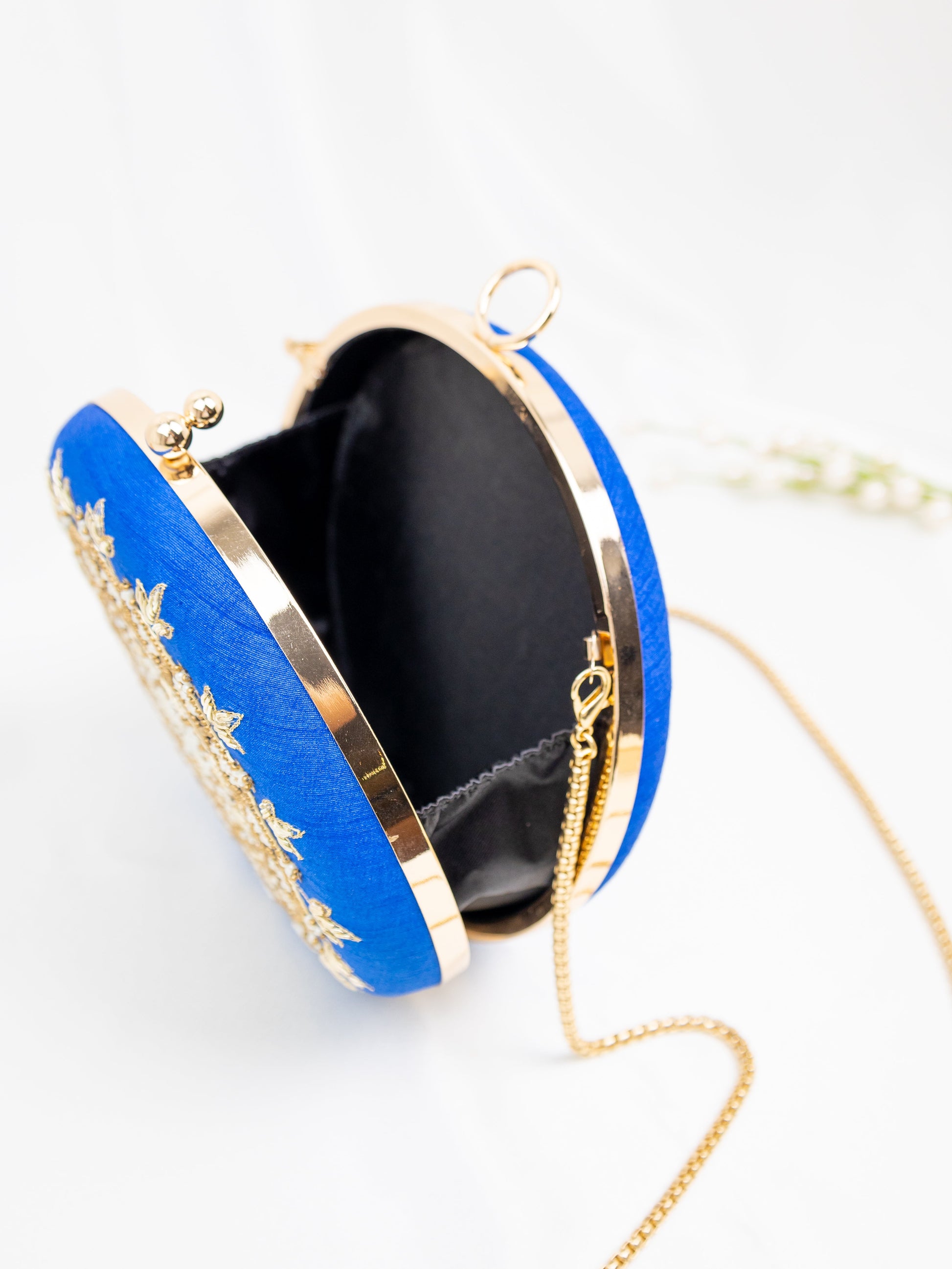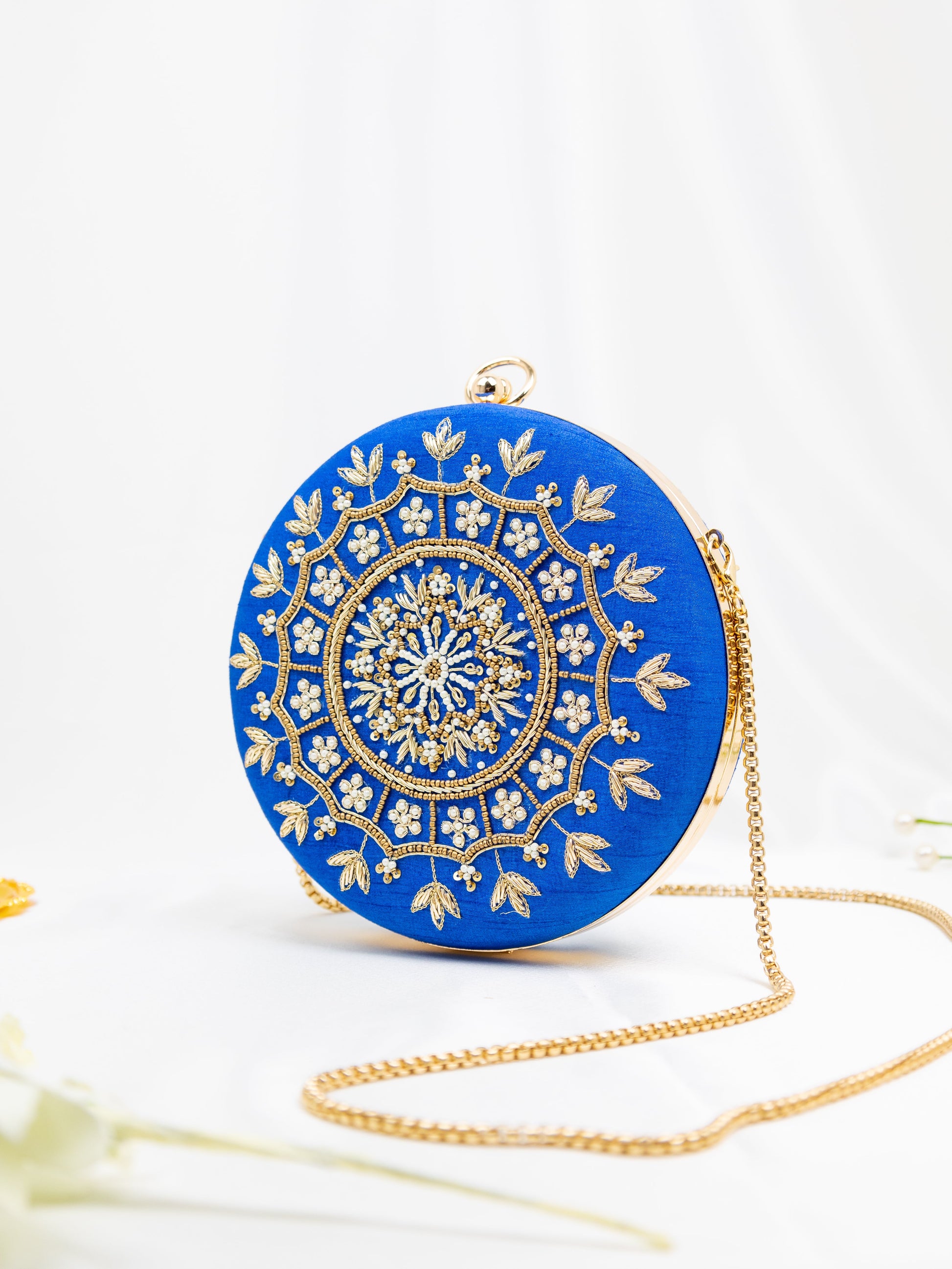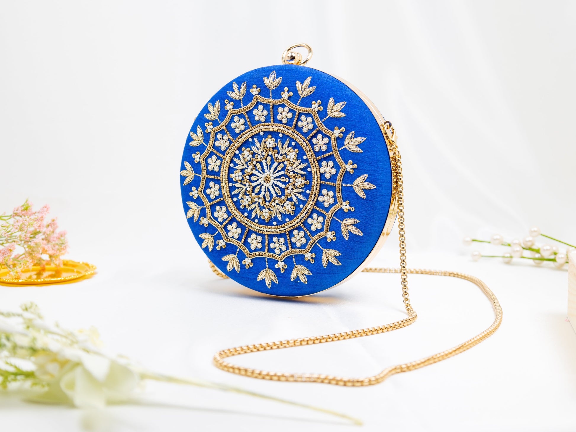 Make a statement with this stunning blue round clutch, beautifully adorned with intricate golden embroidery. Whether you're dressing up for a formal event or a night out on the town, this clutch is the perfect accessory to complete your look.