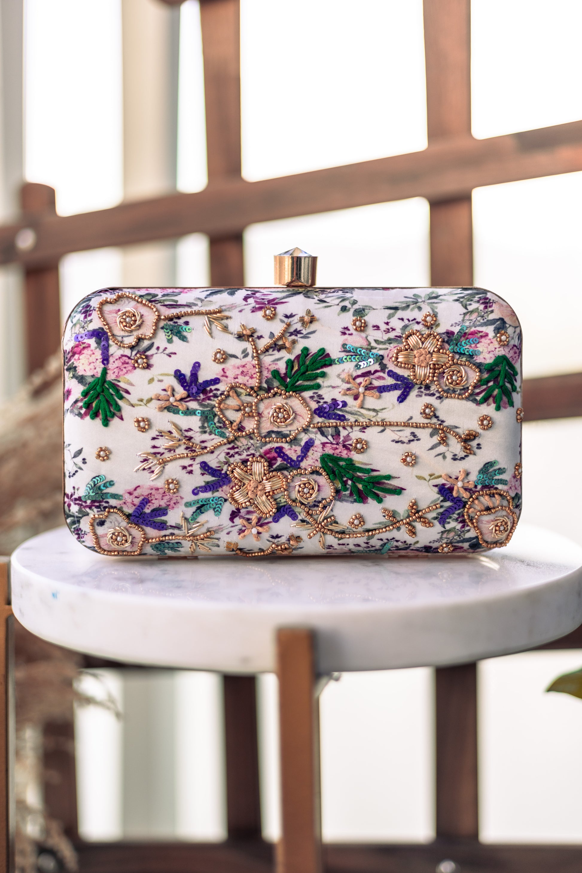 Introducing the captivating "Fleur Clutch" - a masterpiece that seamlessly blends a kaleidoscope of colors with delicate golden embroidery. Crafted from luxurious silk, this multi-color floral clutch is an enchanting accessory that embodies elegance and refinement.