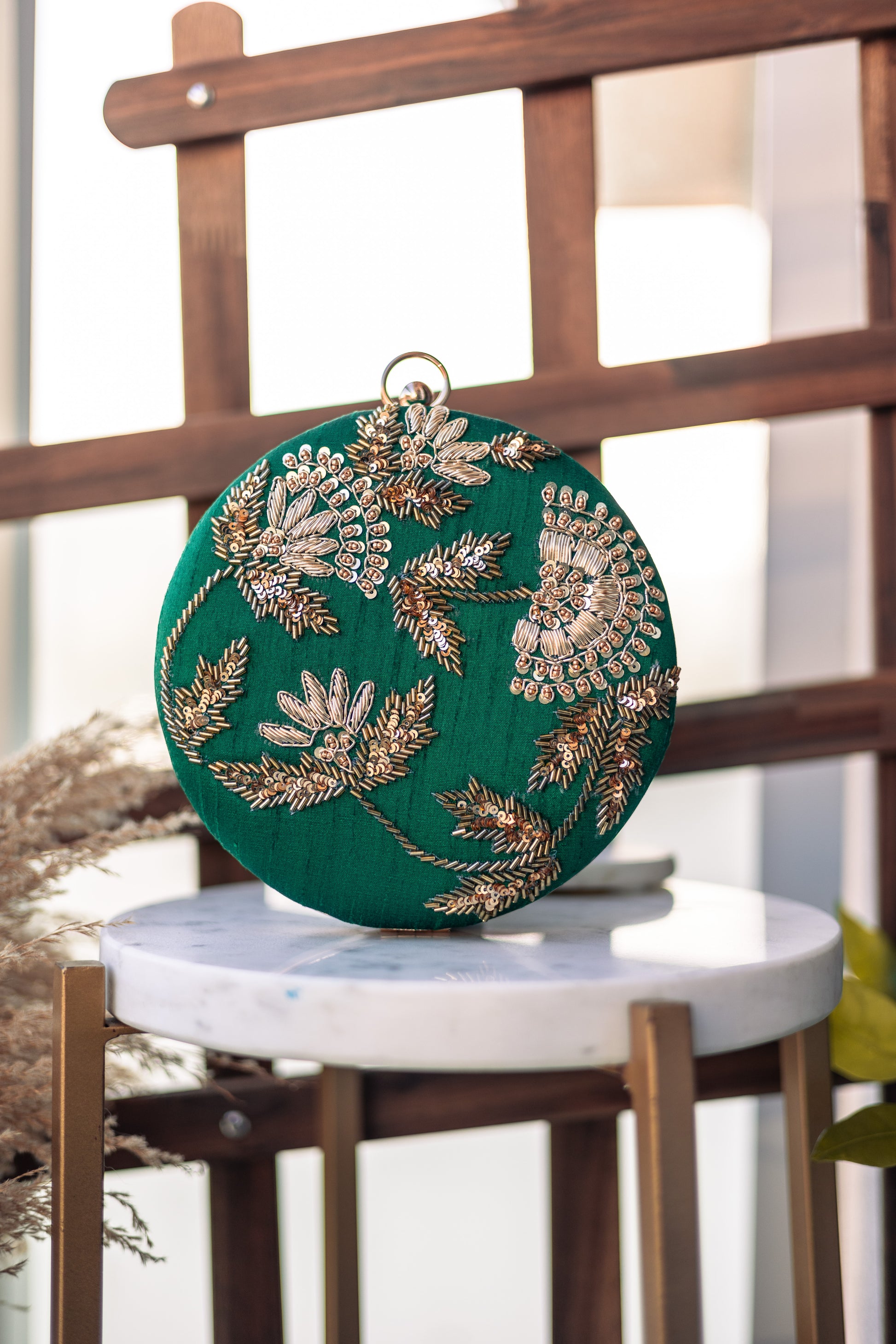 Introducing our Kiara Fleur Clutch - a luxurious and stylish addition to your collection. This designer floral round clutch features intricate golden embroidery that adds a touch of elegance to the beautiful floral pattern.