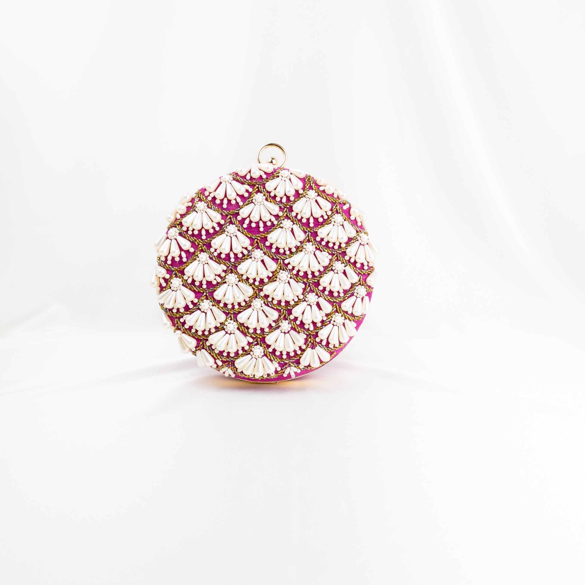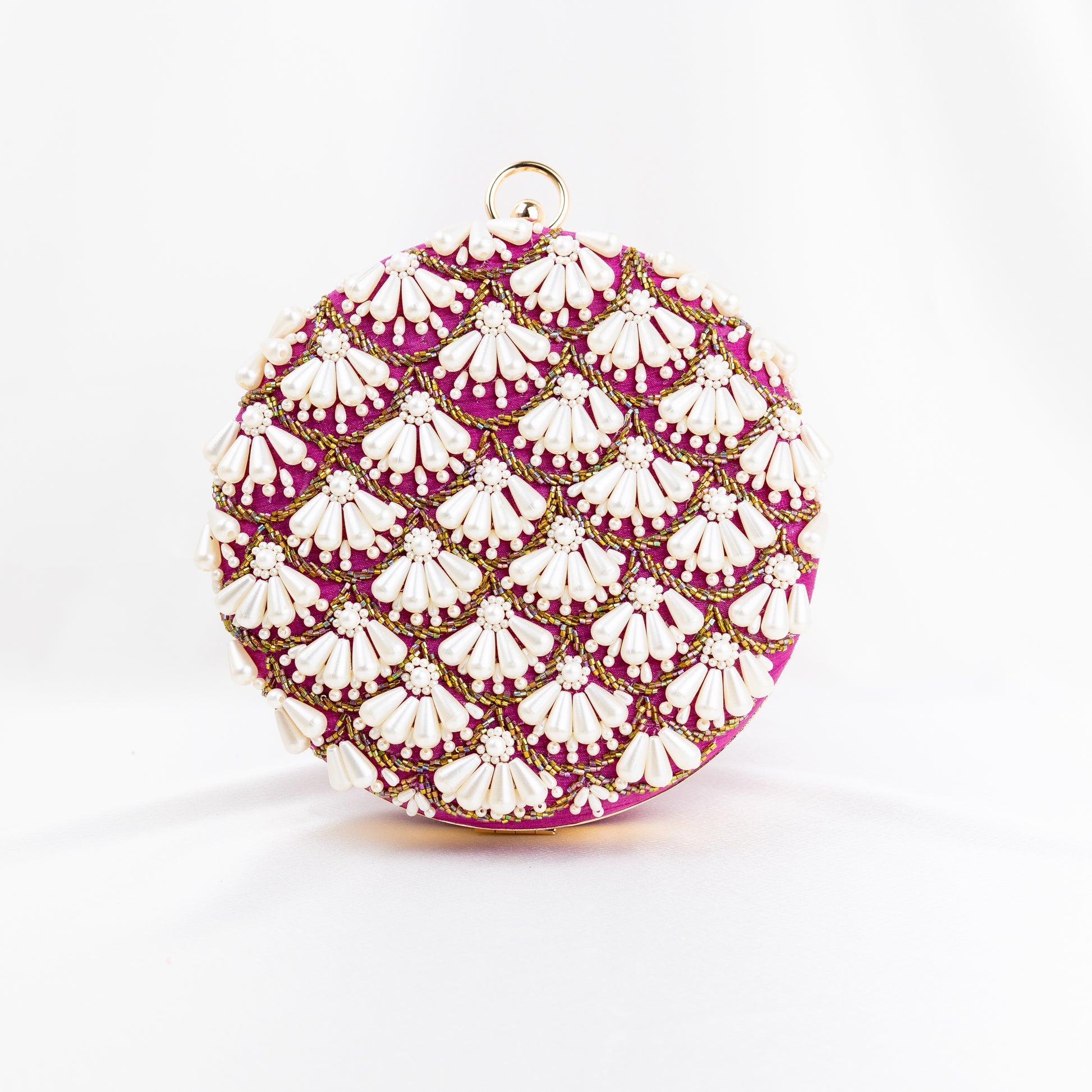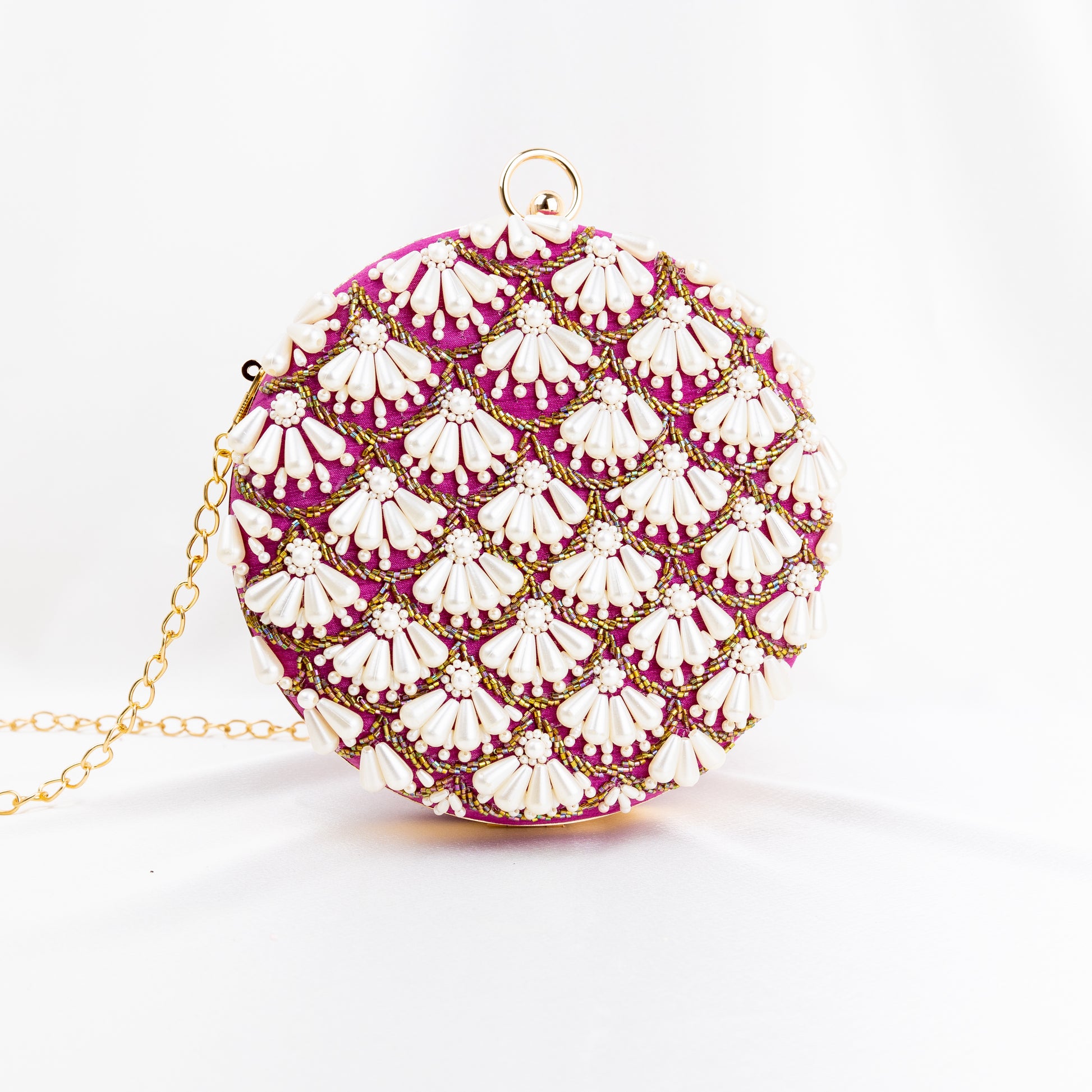 Indulge in the elegance of our Madison Pearl Clutch, a handmade work of art that is sure to turn heads at any event. The luxurious rose round silk clutch is adorned with delicate golden embroidery, showcasing our commitment to craftsmanship and quality.