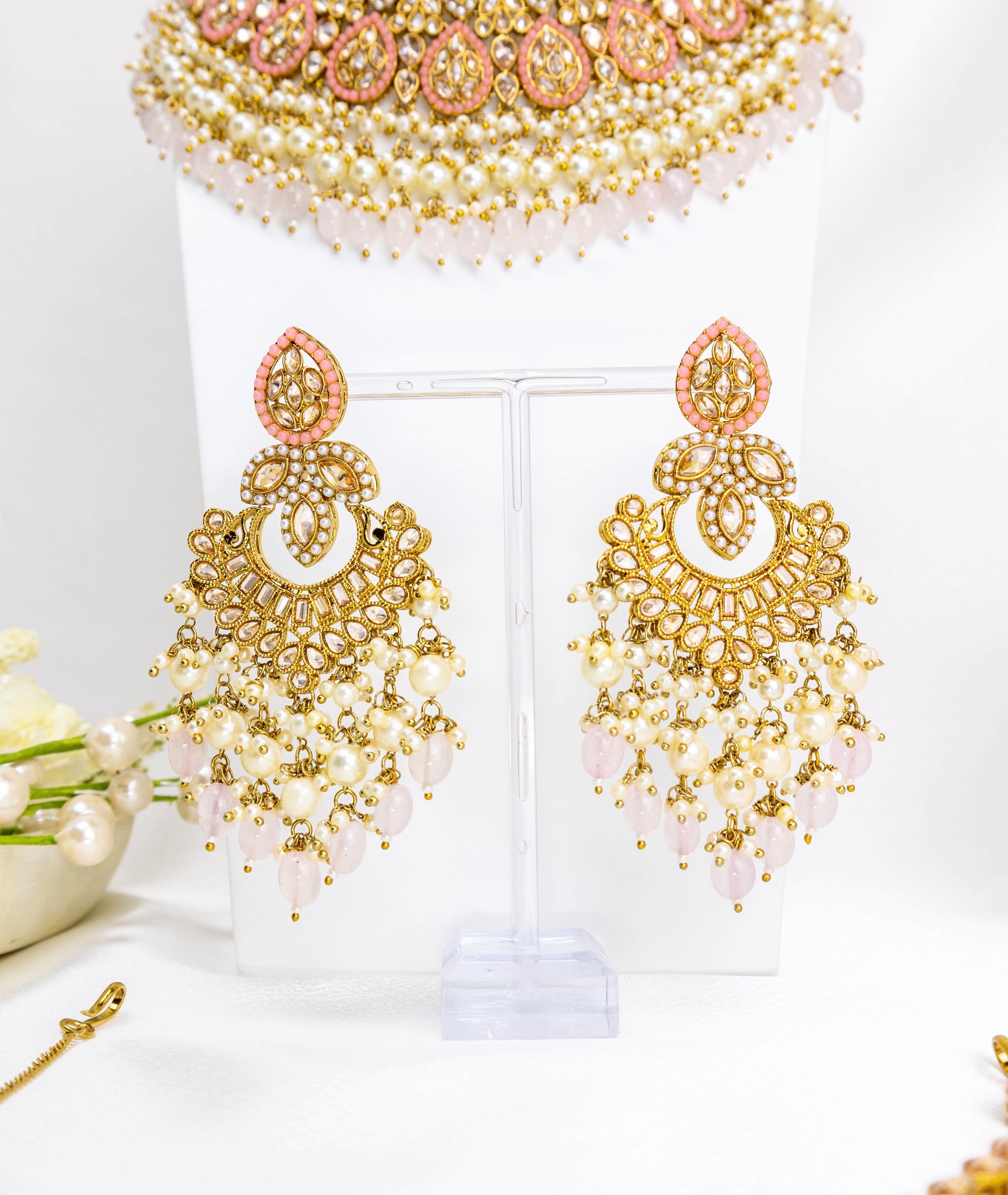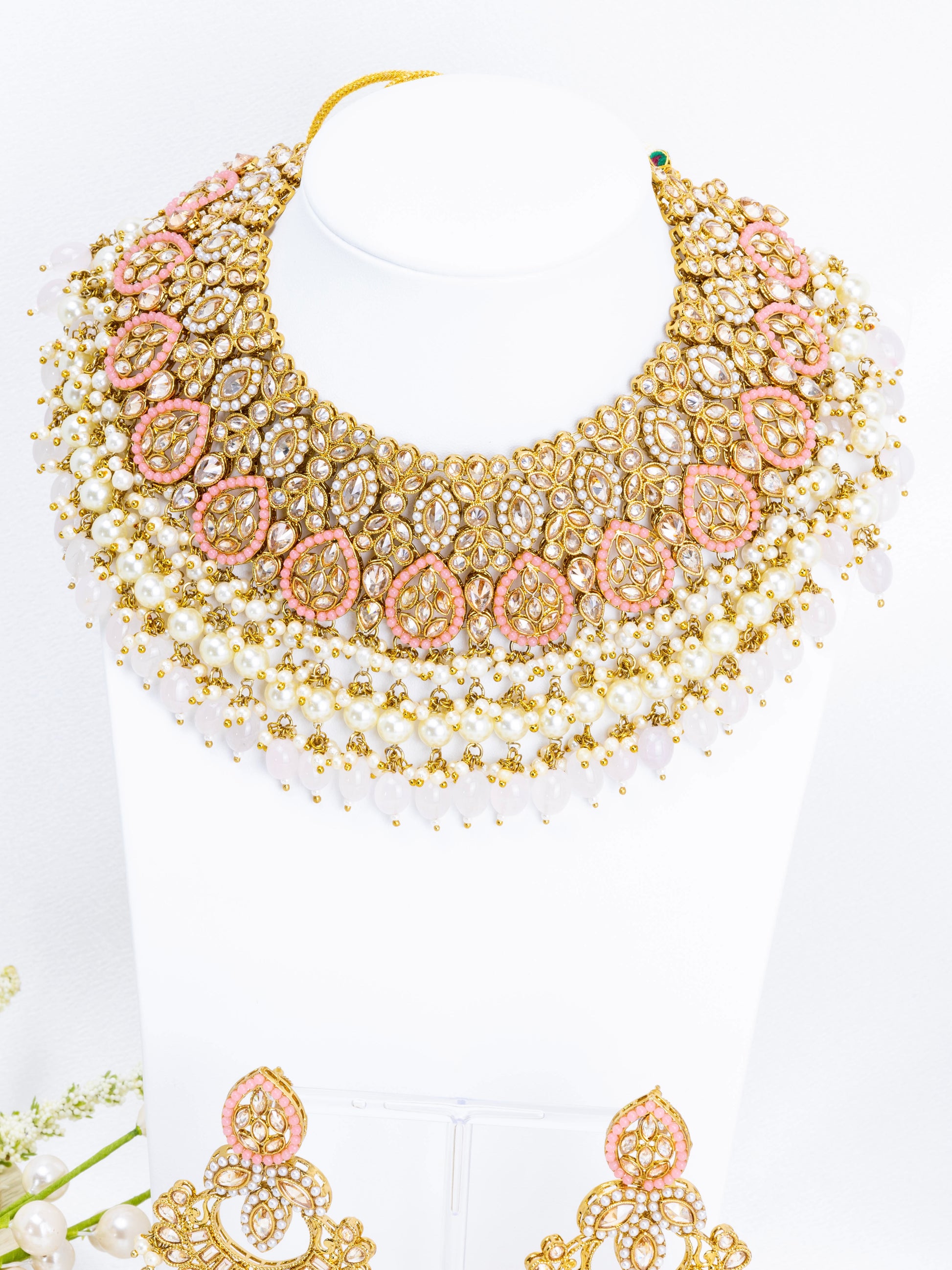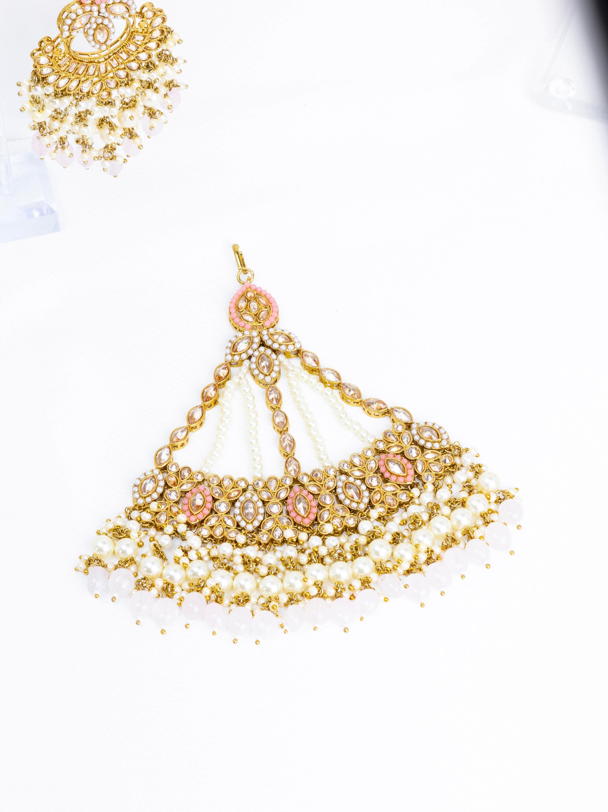 Pink Pearl Bridal Necklace with Earrings, Tikka, and Jhummar.