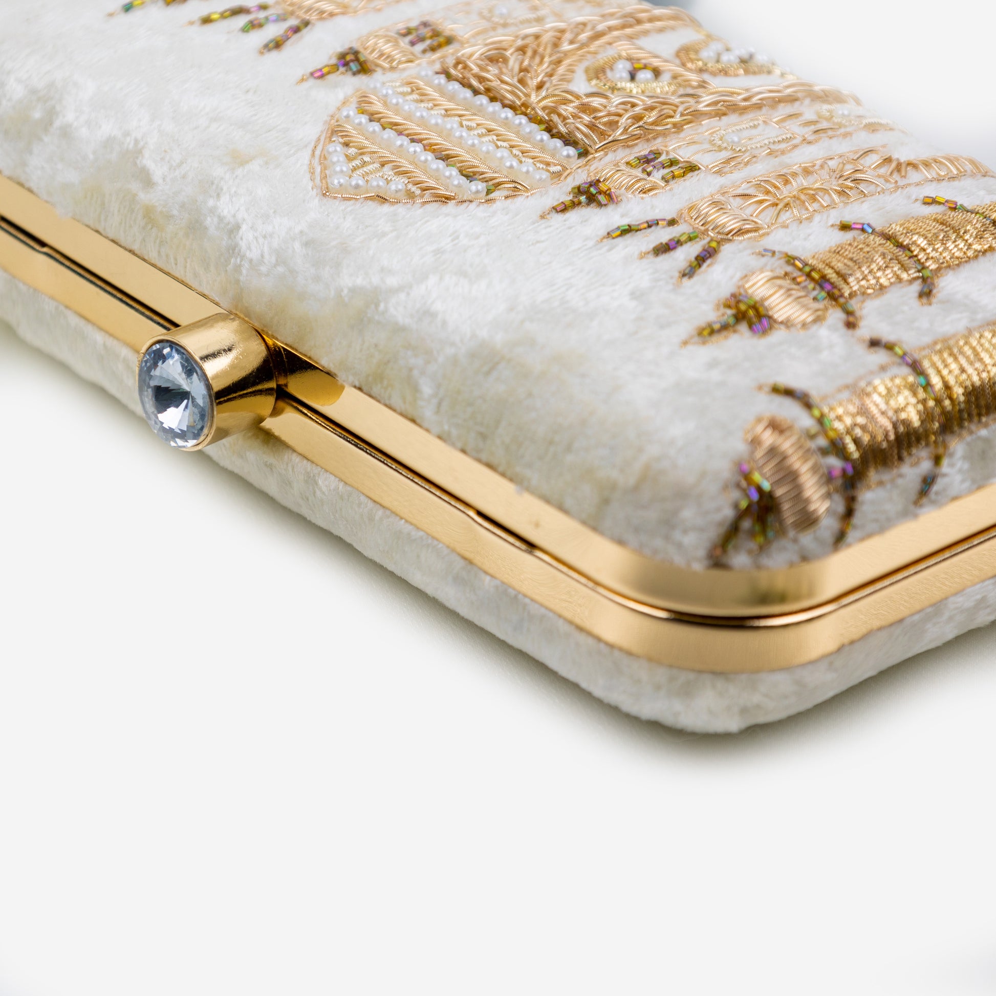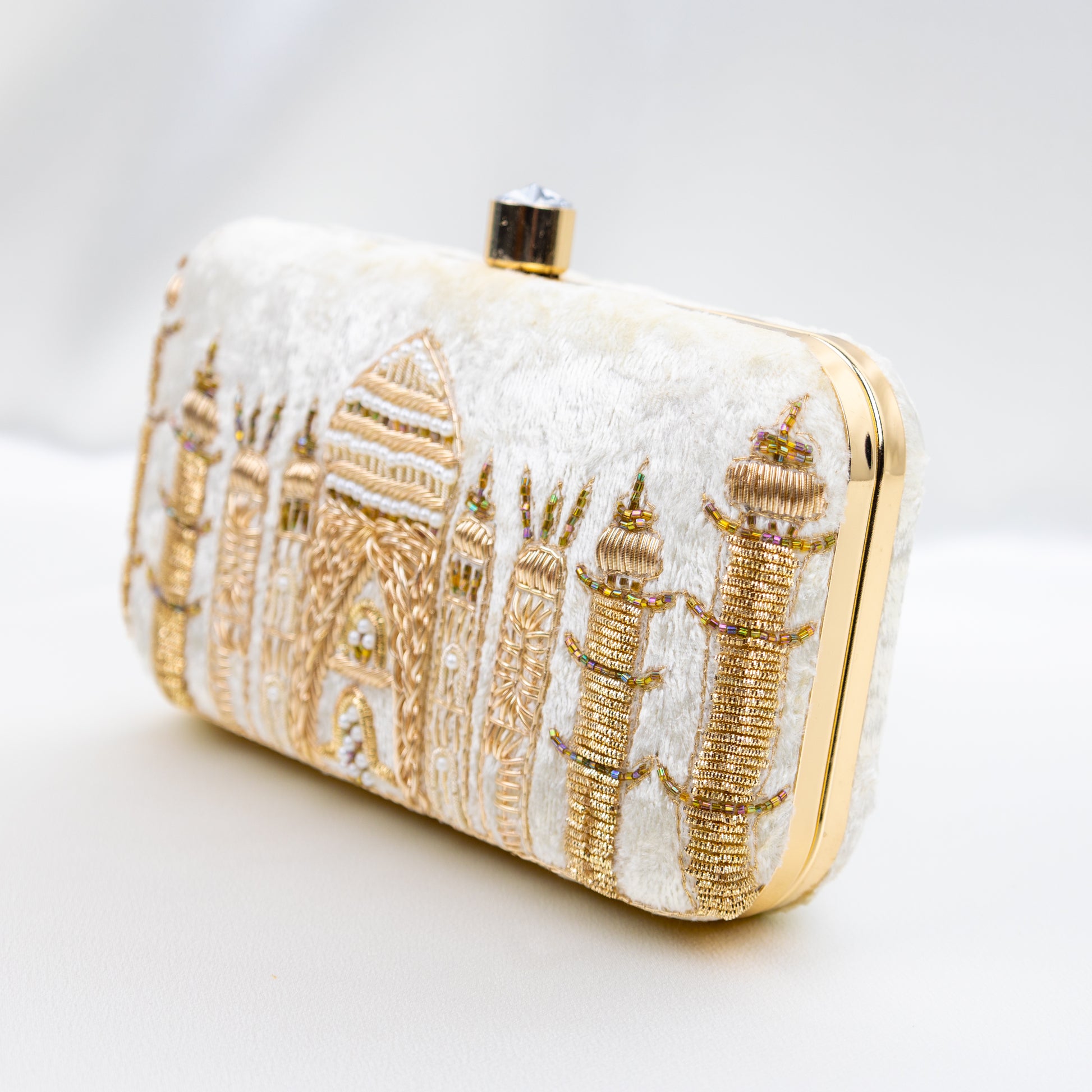 Indulge in the regal allure of the Taj Mahal with our luxurious embroidered clutch on velvet. Expertly crafted with intricate detailing, this opulent accessory is a true masterpiece. Measuring 8 inches by 4 inches, the perfect size to hold all your essentials, this clutch is adorned with a stunning embroidered depiction of the Taj Mahal, capturing the grandeur and majesty of this iconic monument.