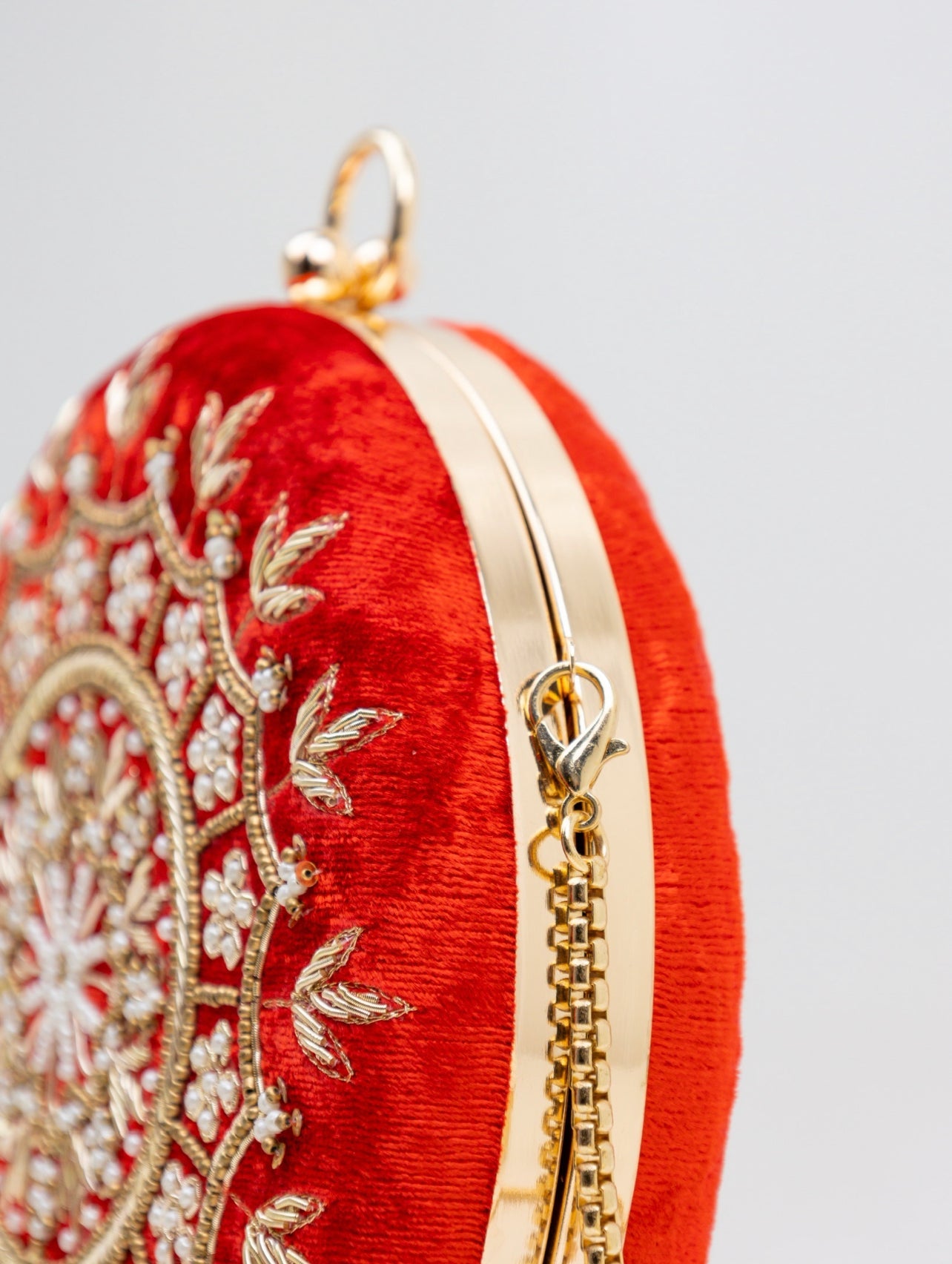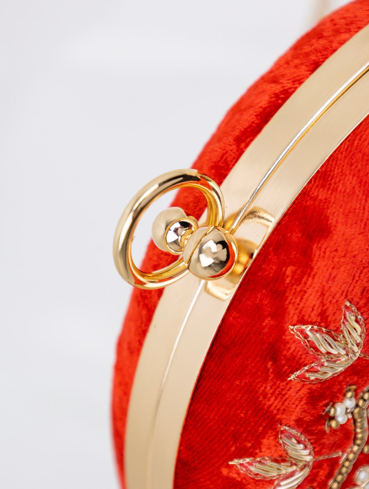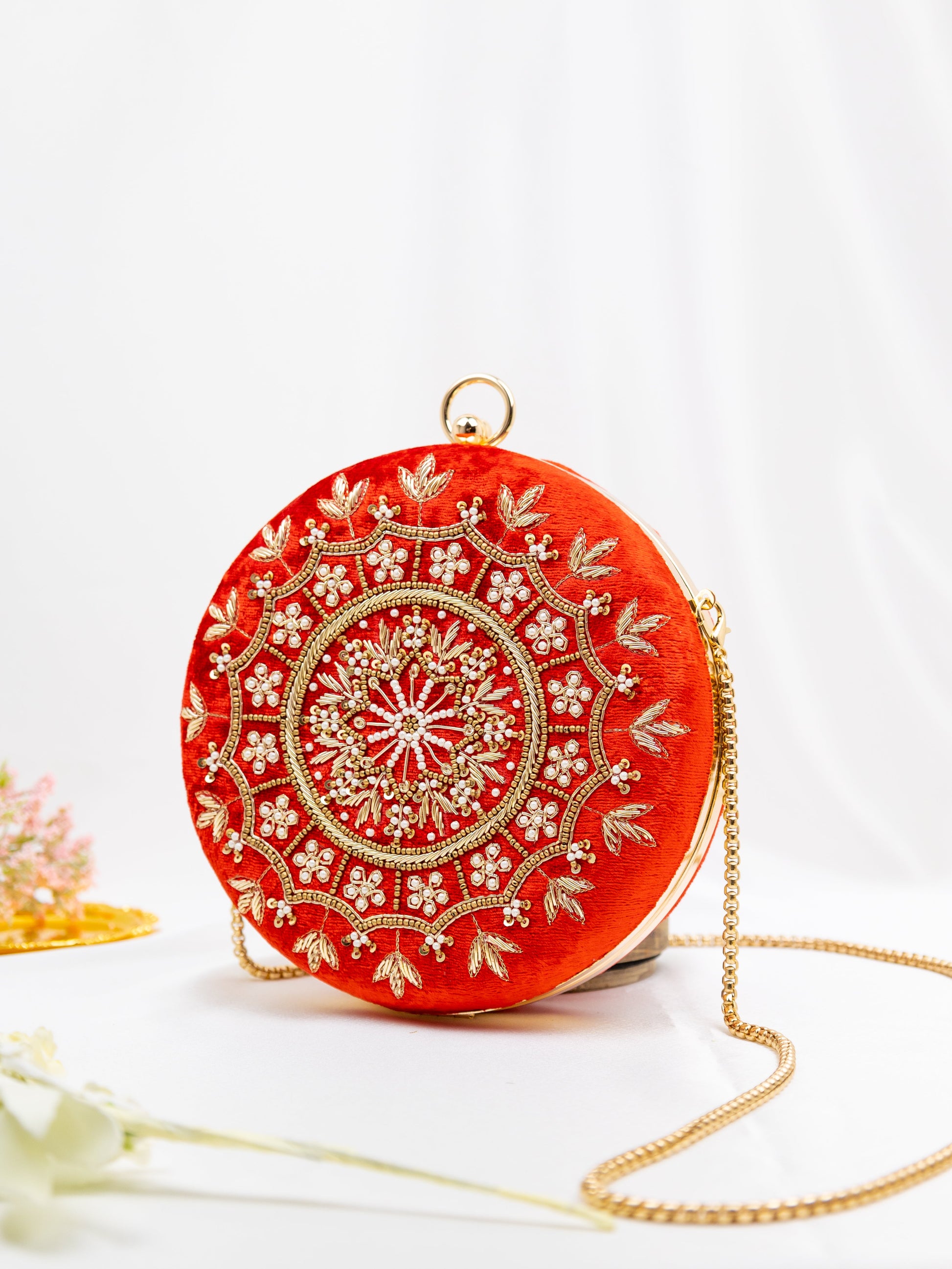 Red velvet, round clutch with golden embroidery. Includes golden chain.