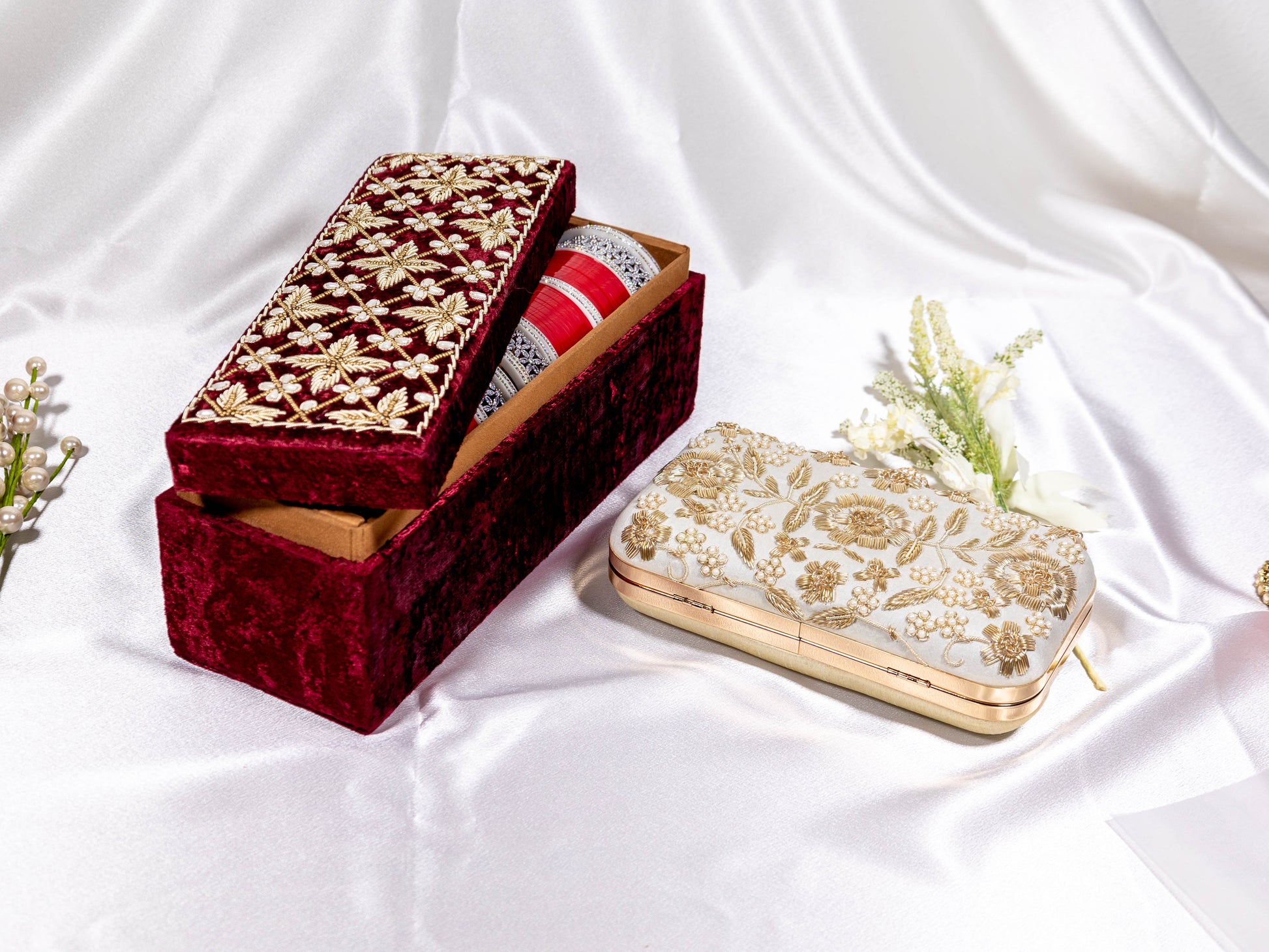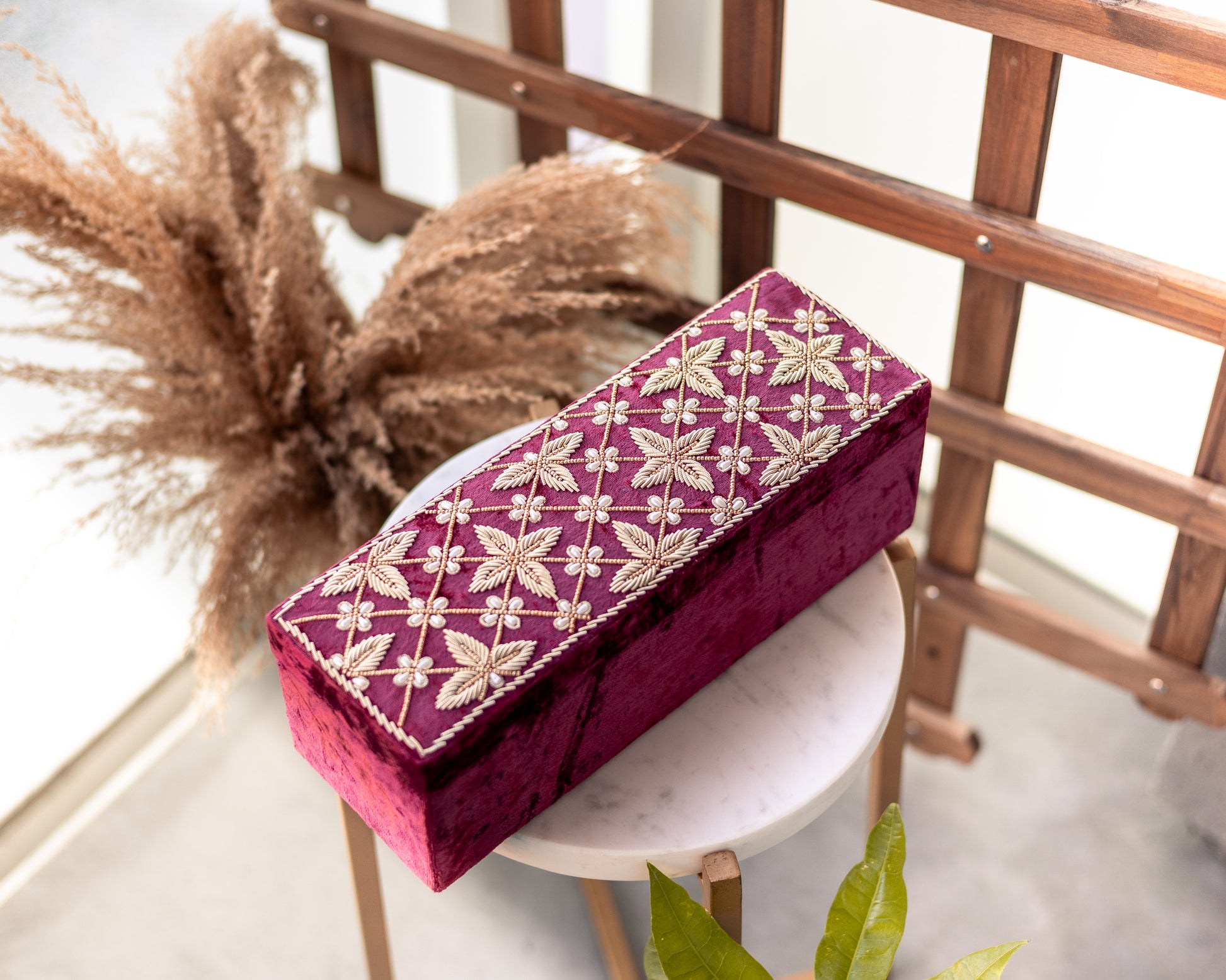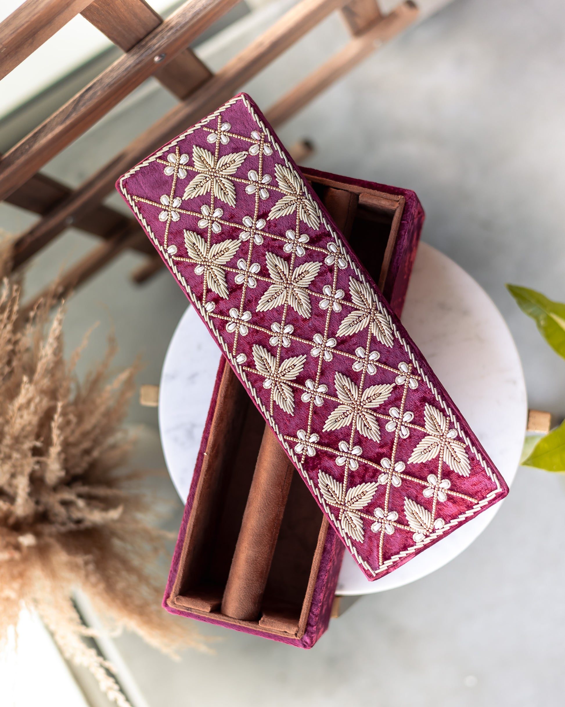 Indulge in luxury with our Royal Crimson Velvet Bangle Box. This beautiful box is handcrafted with intricate embroidery and features a single rod to keep your bangles organized and easily accessible. The interior is lined with soft suede, giving you a premium feel every time you open the box. With dimensions of 11.8 inches by 3.9 inches by 3.9 inches, this box is perfect for storing and showcasing your most treasured bangles. Add a touch of regal elegance to your jewelry collection with our Royal Crimson Velvet Bangle Box.
