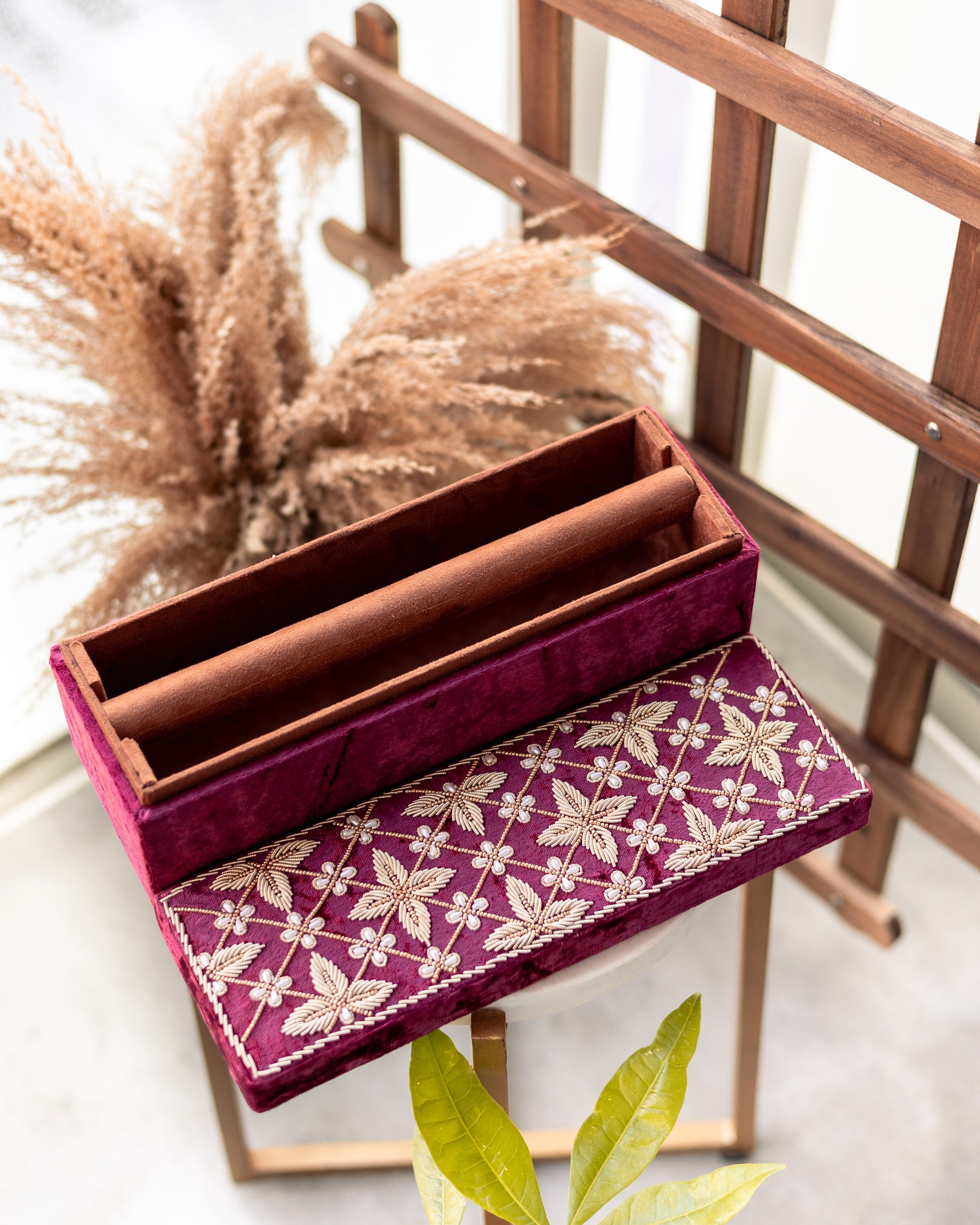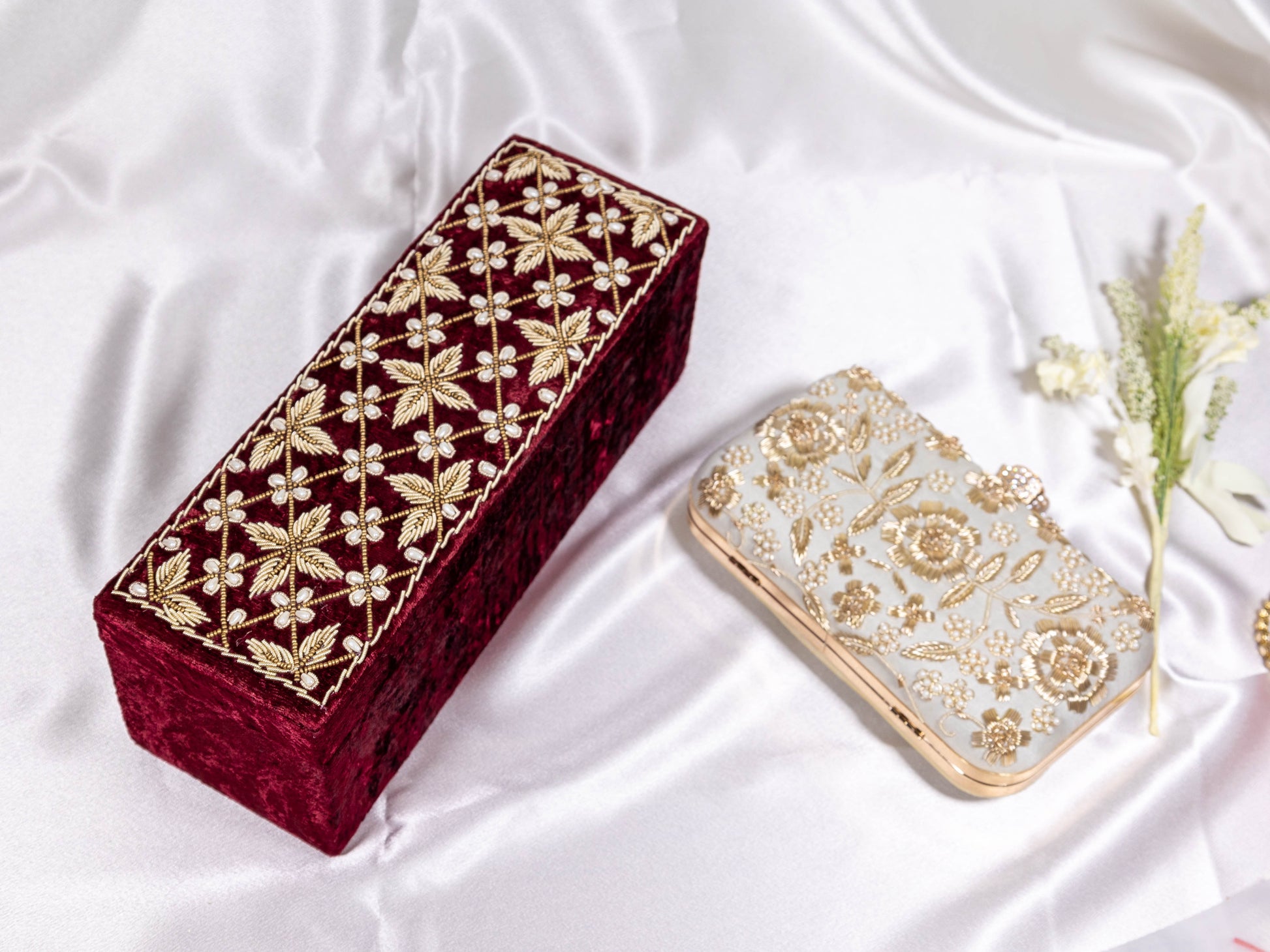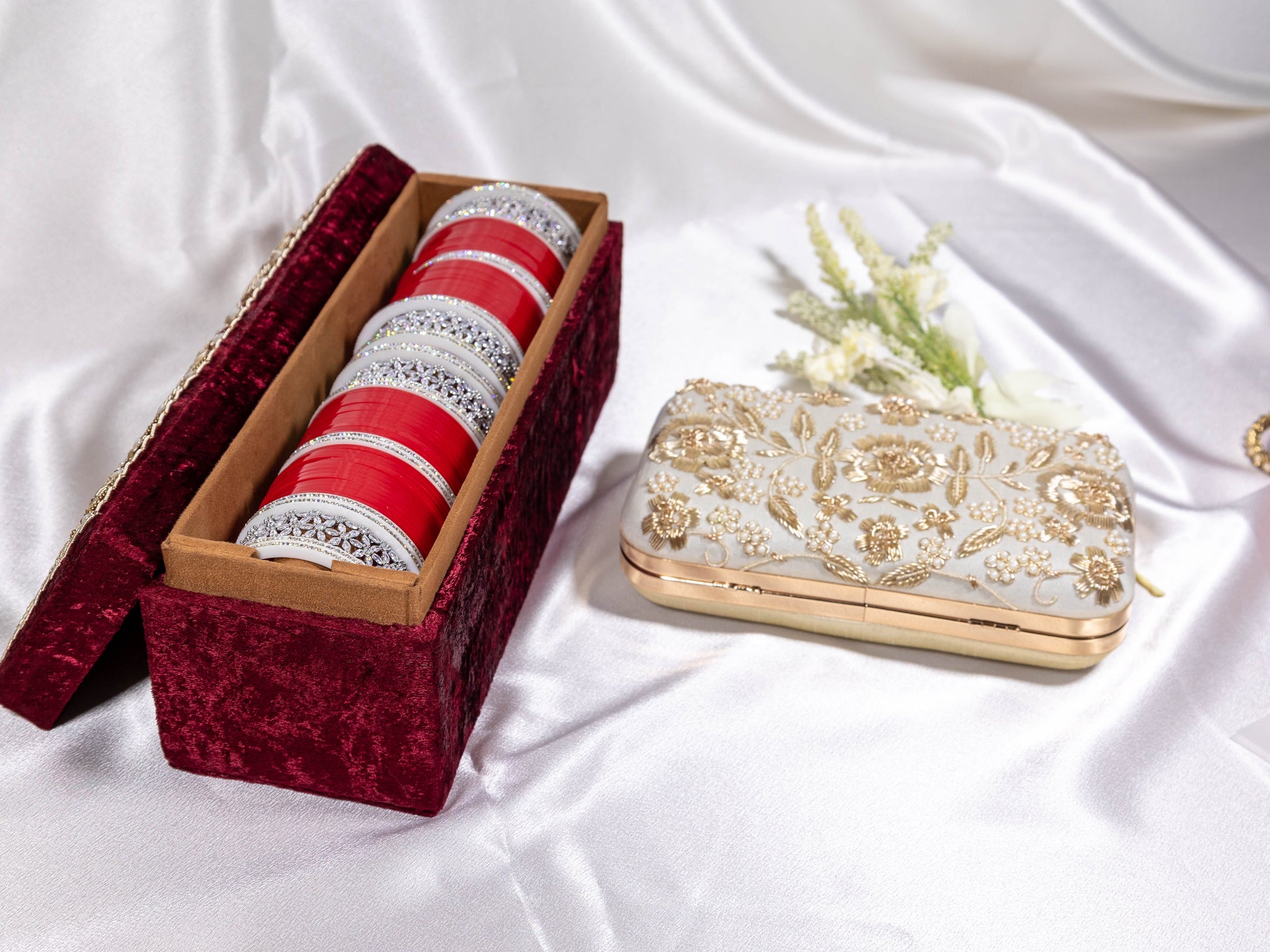 Indulge in luxury with our Royal Crimson Velvet Bangle Box. This beautiful box is handcrafted with intricate embroidery and features a single rod to keep your bangles organized and easily accessible. The interior is lined with soft suede, giving you a premium feel every time you open the box. With dimensions of 11.8 inches by 3.9 inches by 3.9 inches, this box is perfect for storing and showcasing your most treasured bangles. Add a touch of regal elegance to your jewelry collection with our Royal Crimson Velvet Bangle Box.