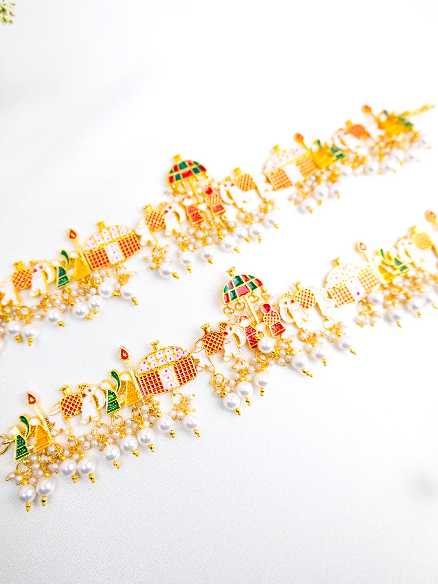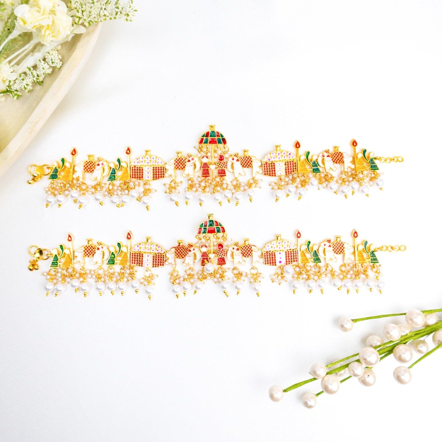 Vidaai inspired Gold Plated multicolored anklets with white beads.