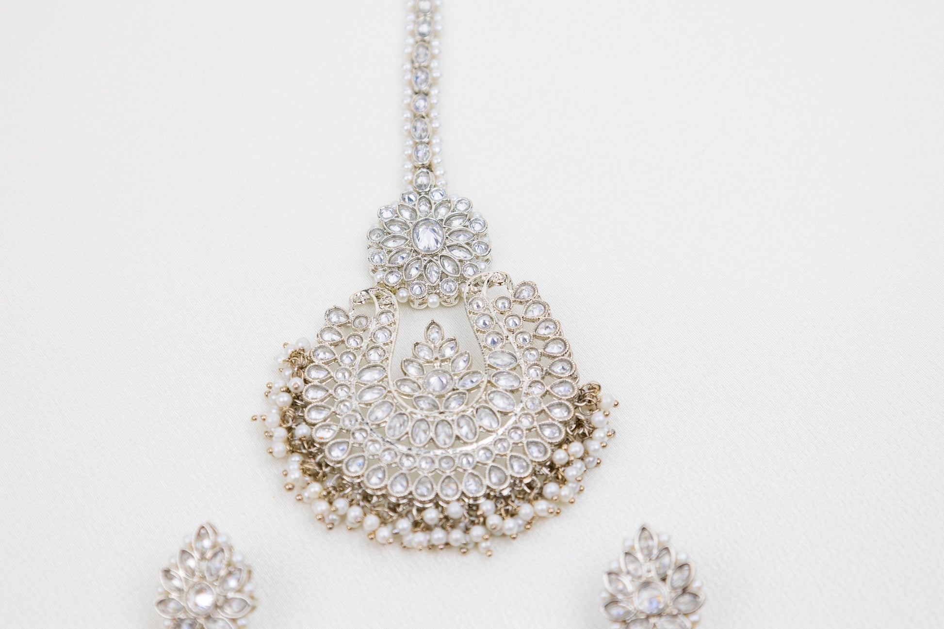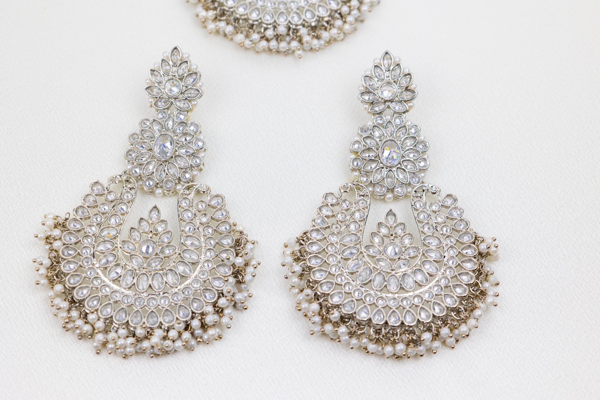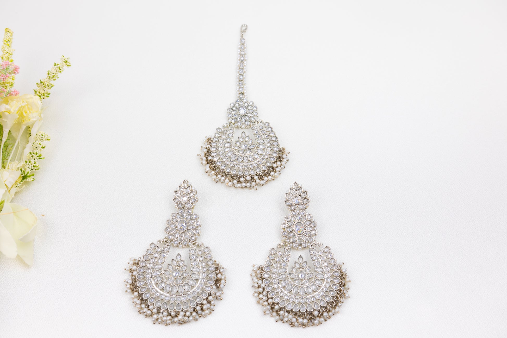 Large princess style hanging earrings with emerald-toned stones and a complimentary tikka.