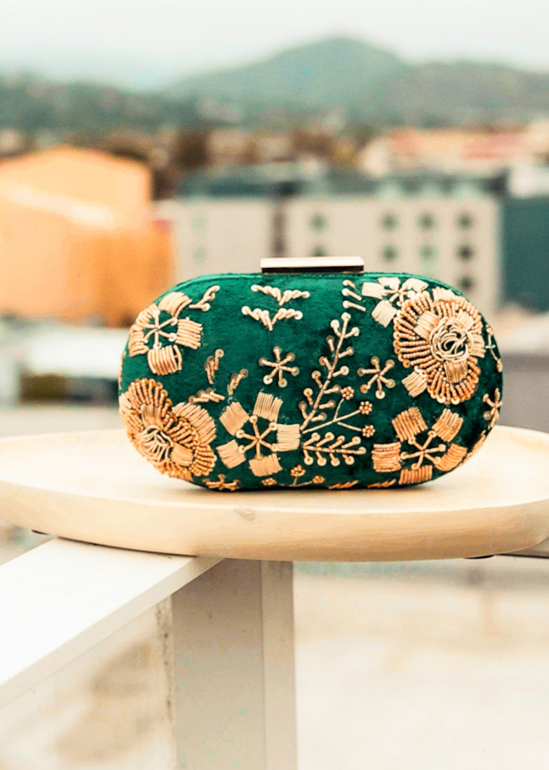 Indulge in a world of elegance and refinement with our exquisite golden hand-embroidered green clutch, a true masterpiece that captures the essence of Noor Zaara's impeccable craftsmanship and sophistication.
