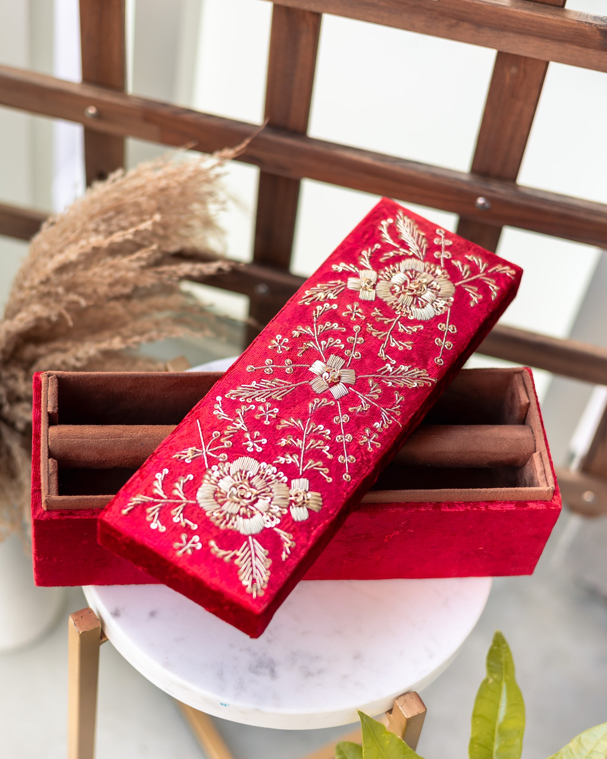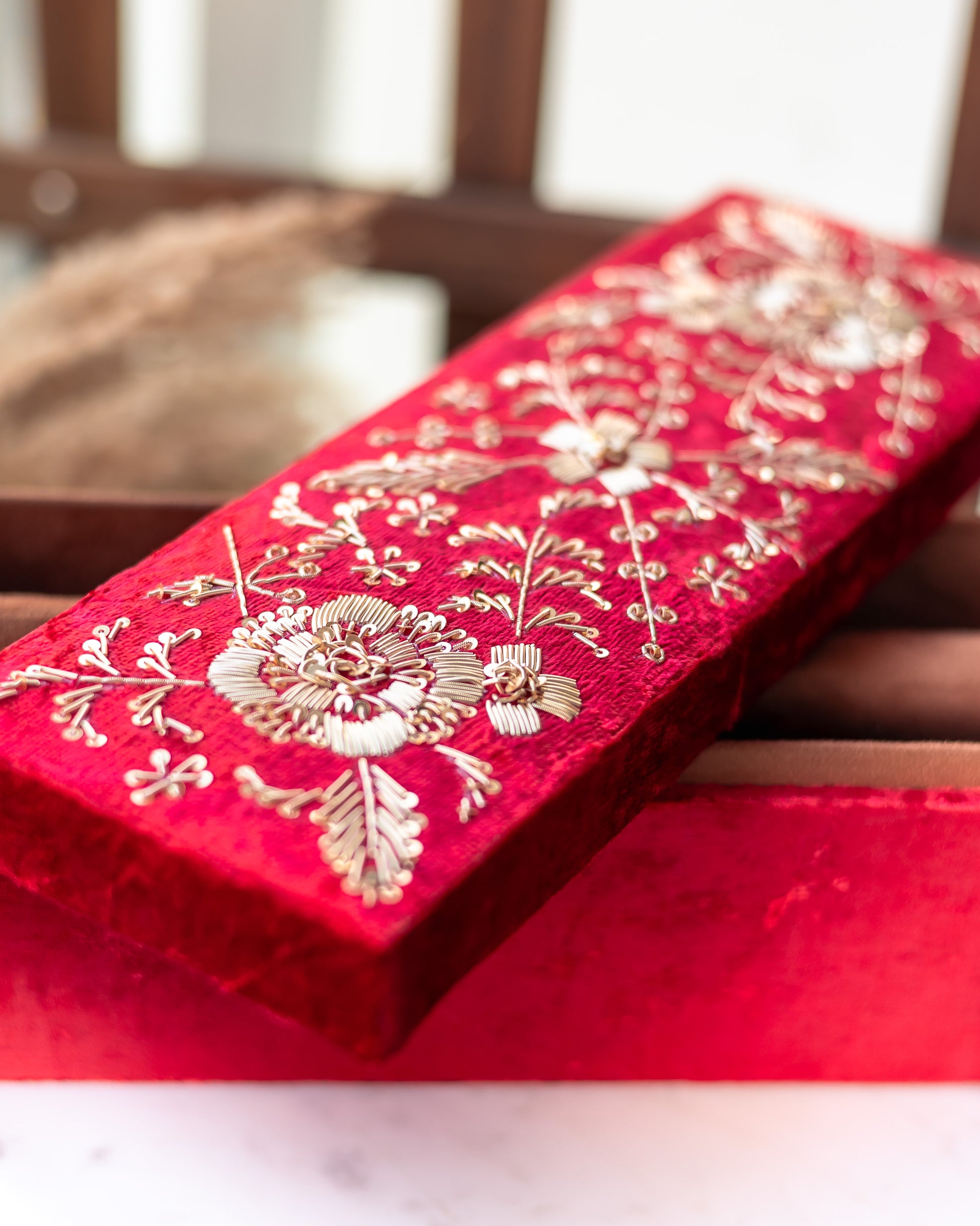 Our Red Velvet Embroidered Bangle Box is the perfect way to keep your bangles safe and secure, while also adding a touch of elegance to your dressing table.