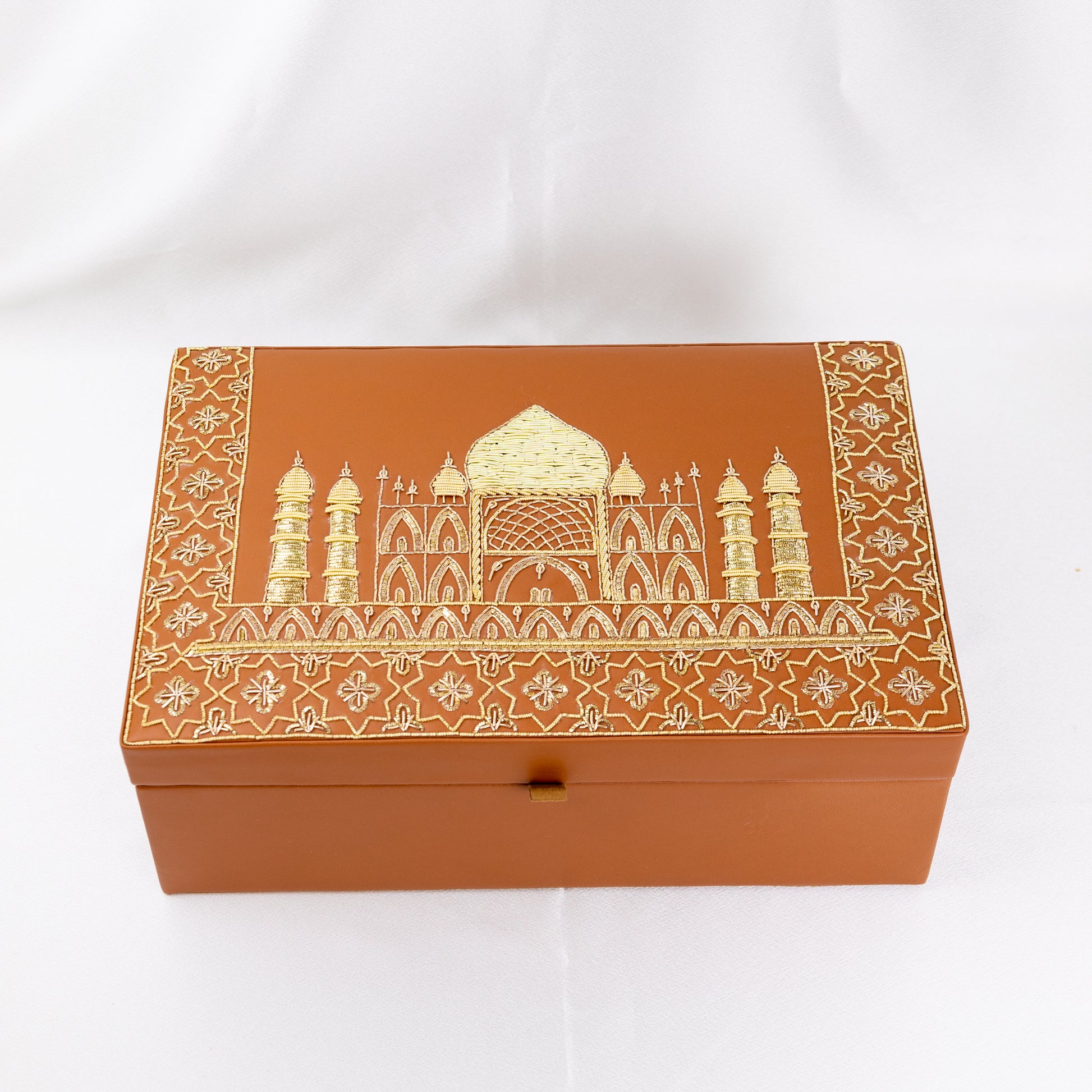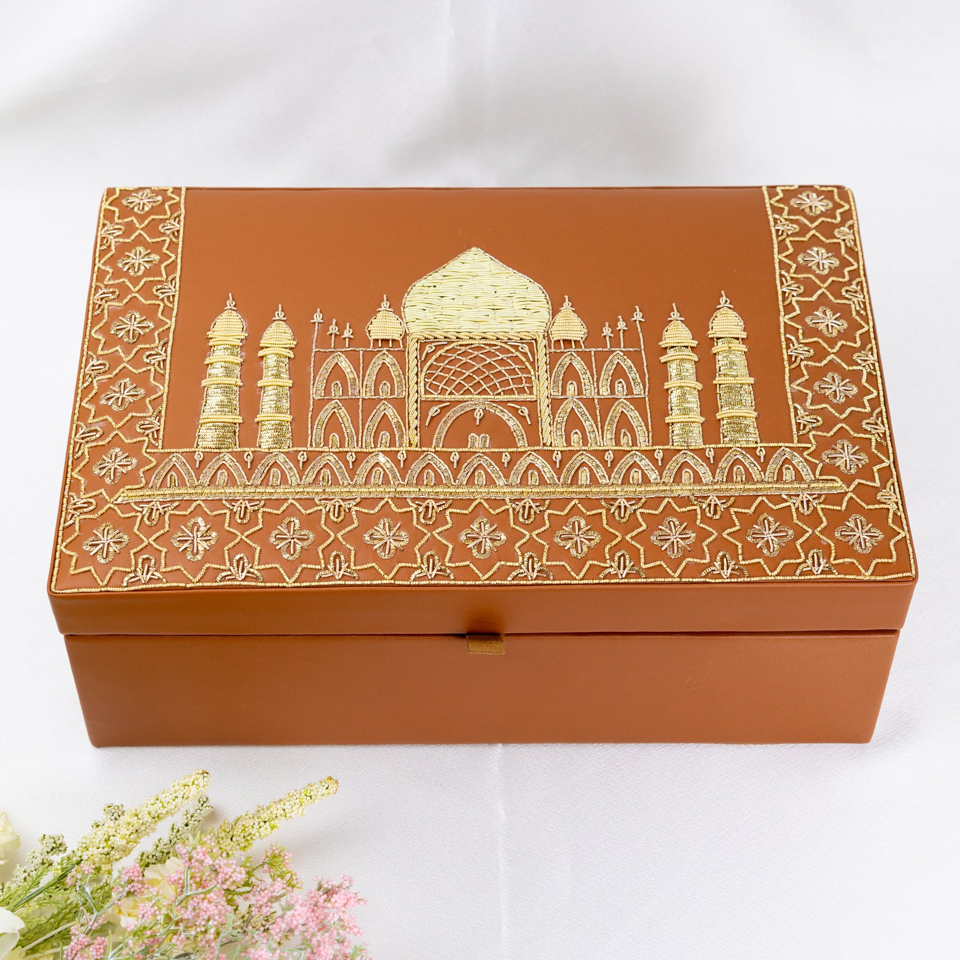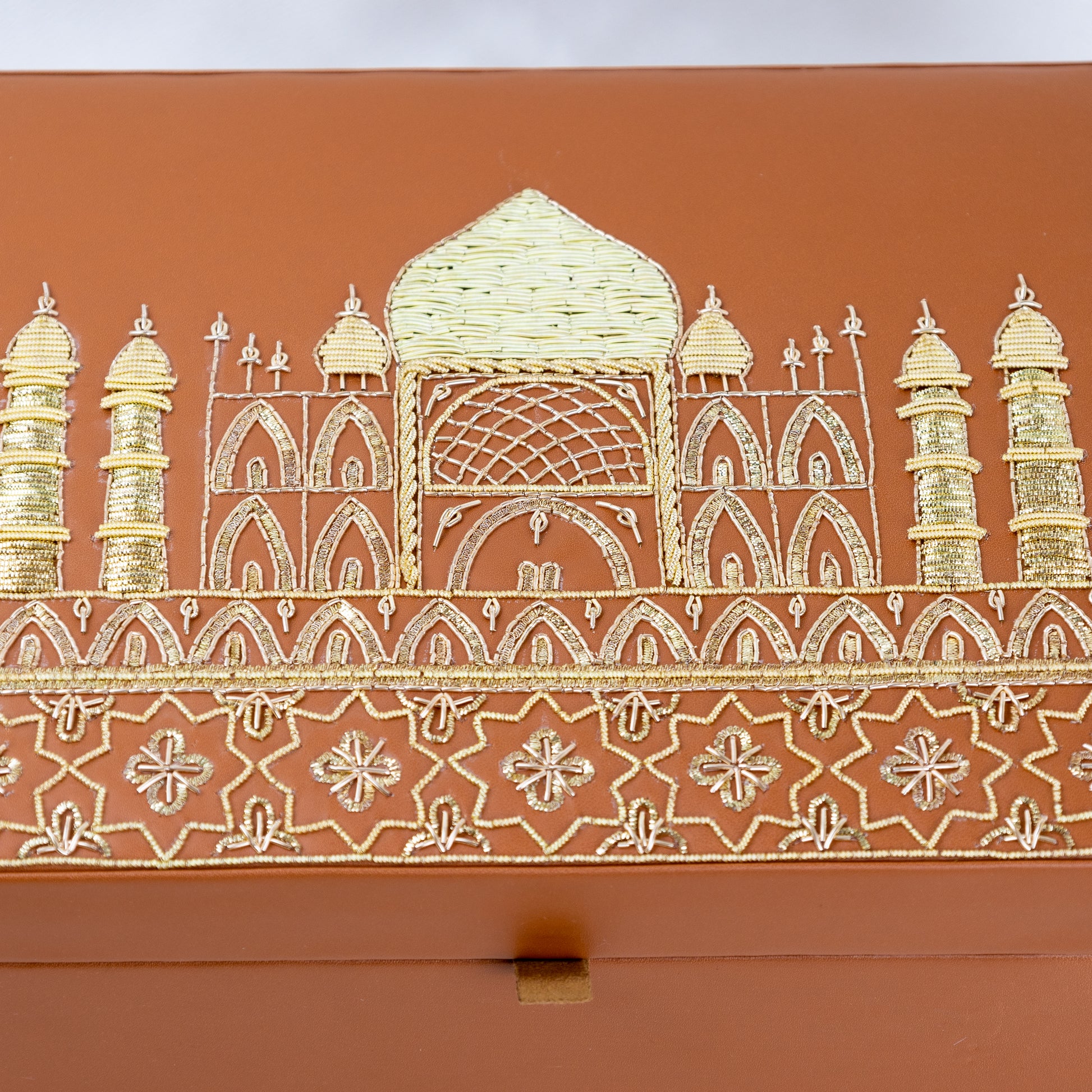 Embroidered Taj Mahal Trousseau Box made with vegan leather.