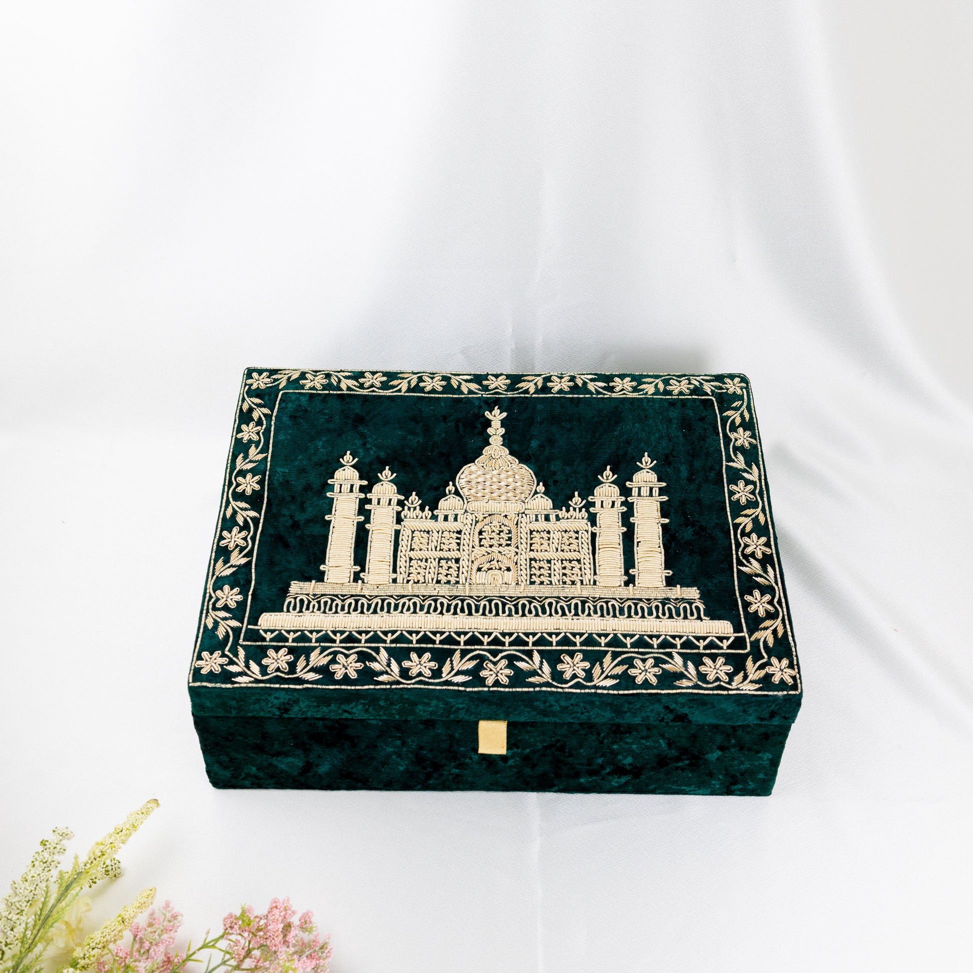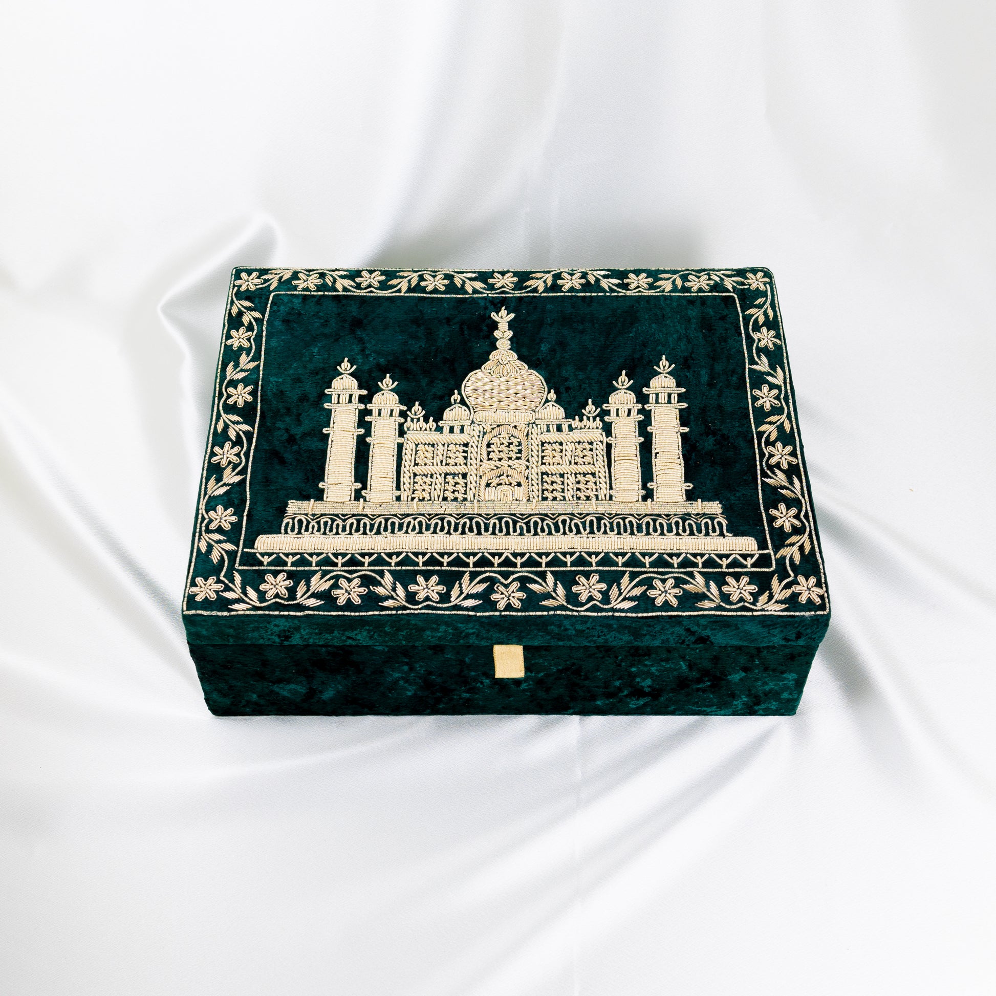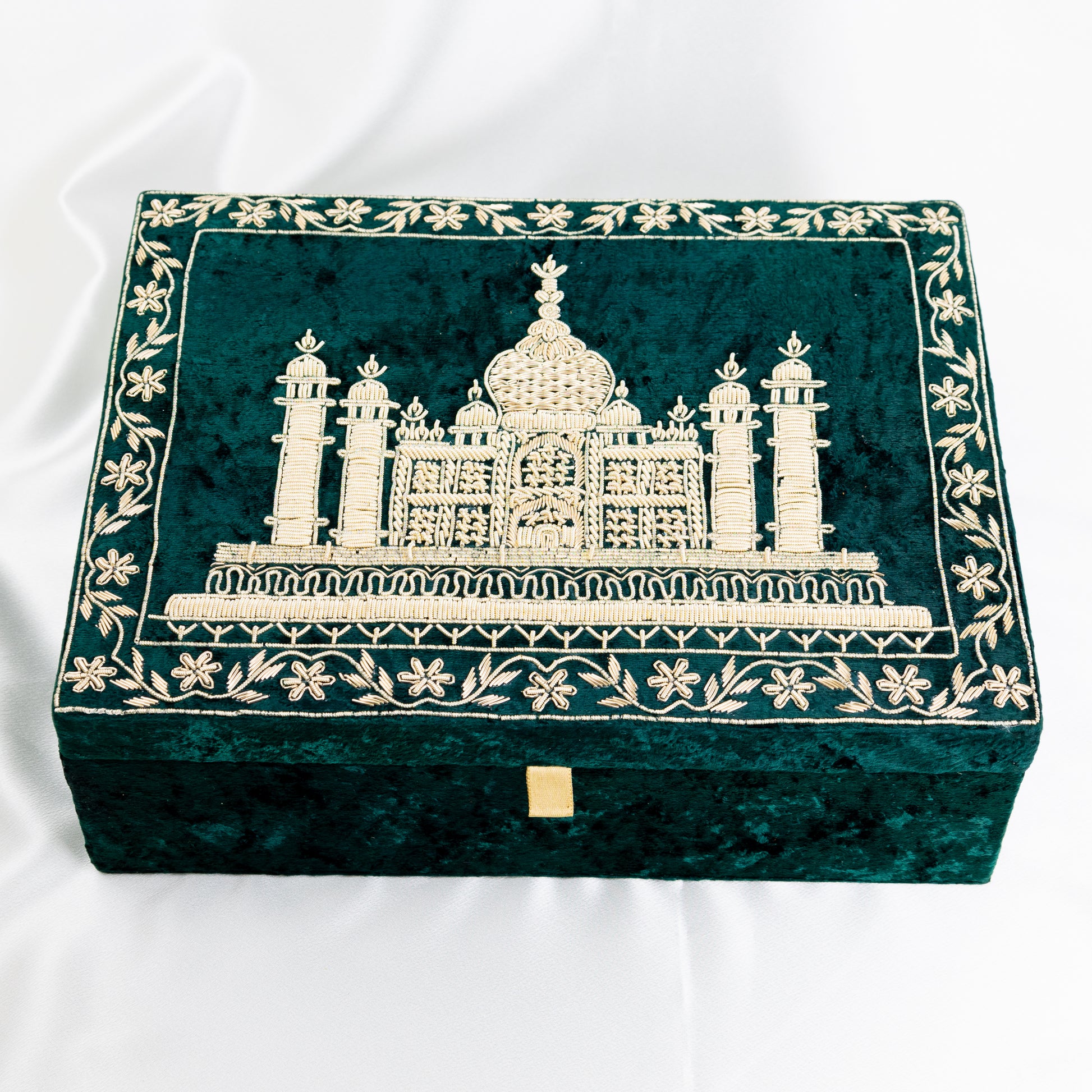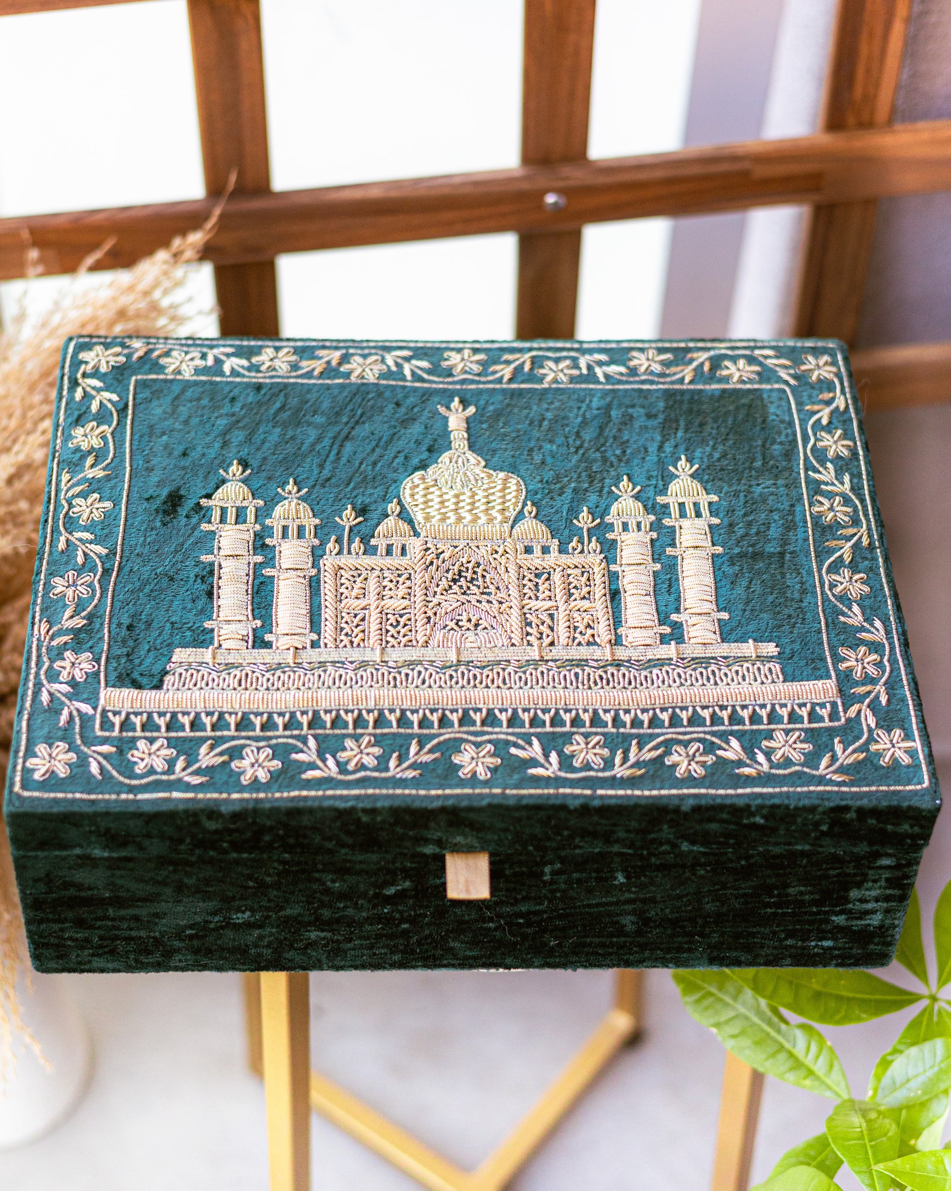 Elevate your jewelry game with our Embroidered Taj Mahal Velvet Jewelry Box in Green and experience the luxurious feel of Mughal royalty every time you use it.