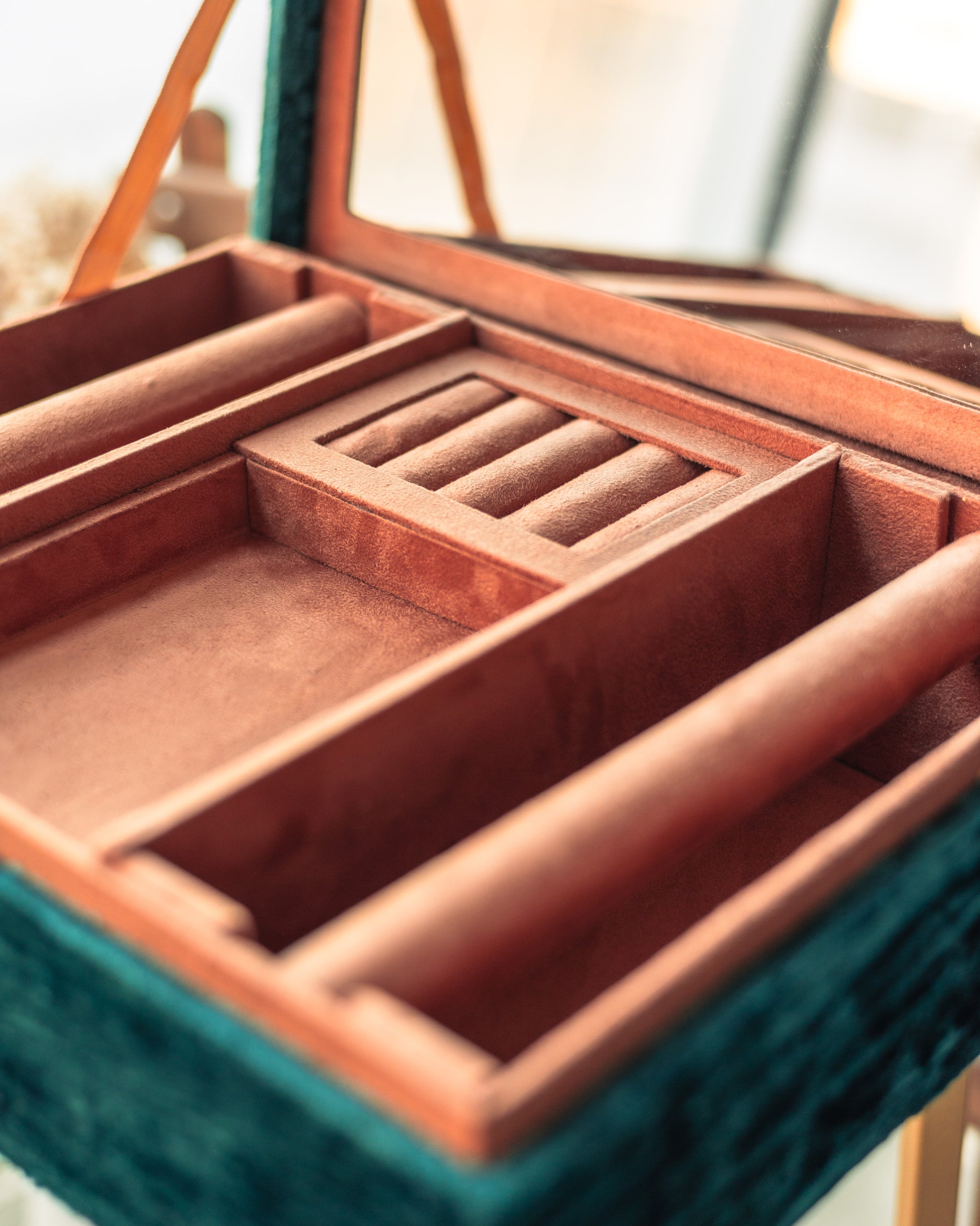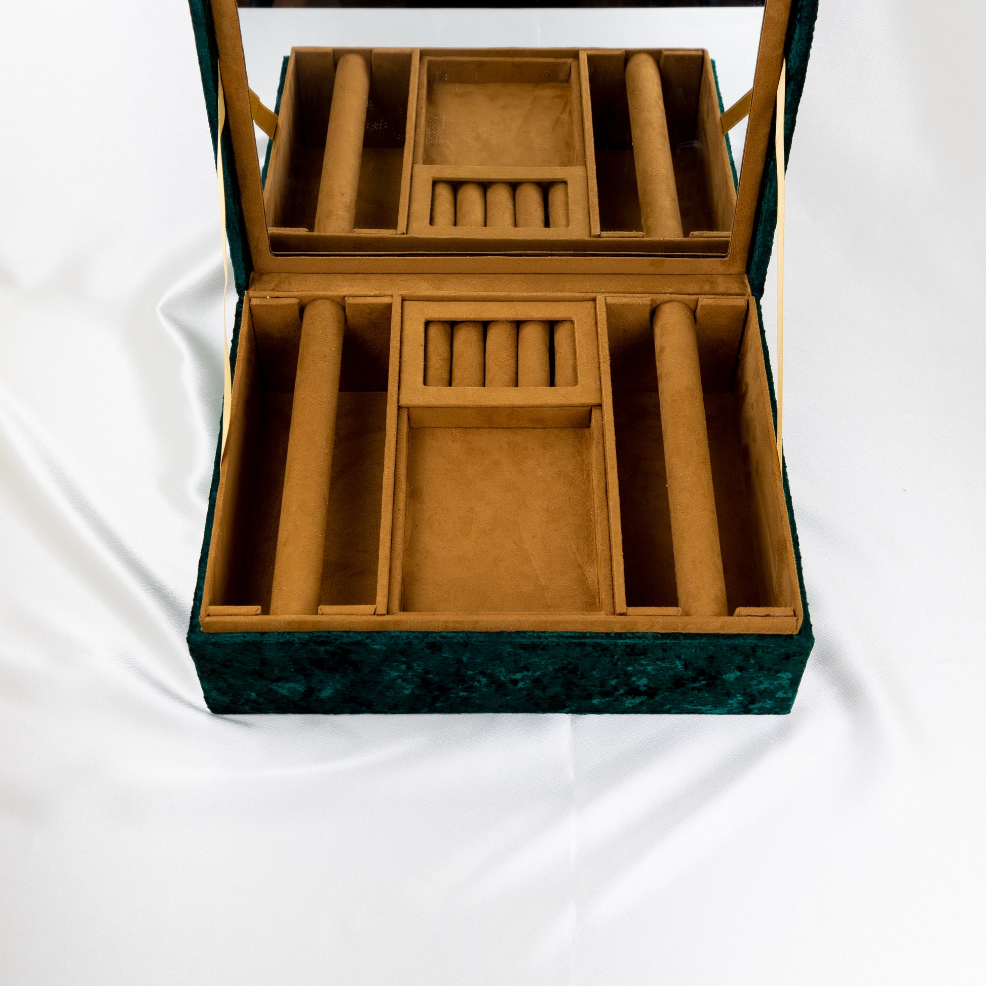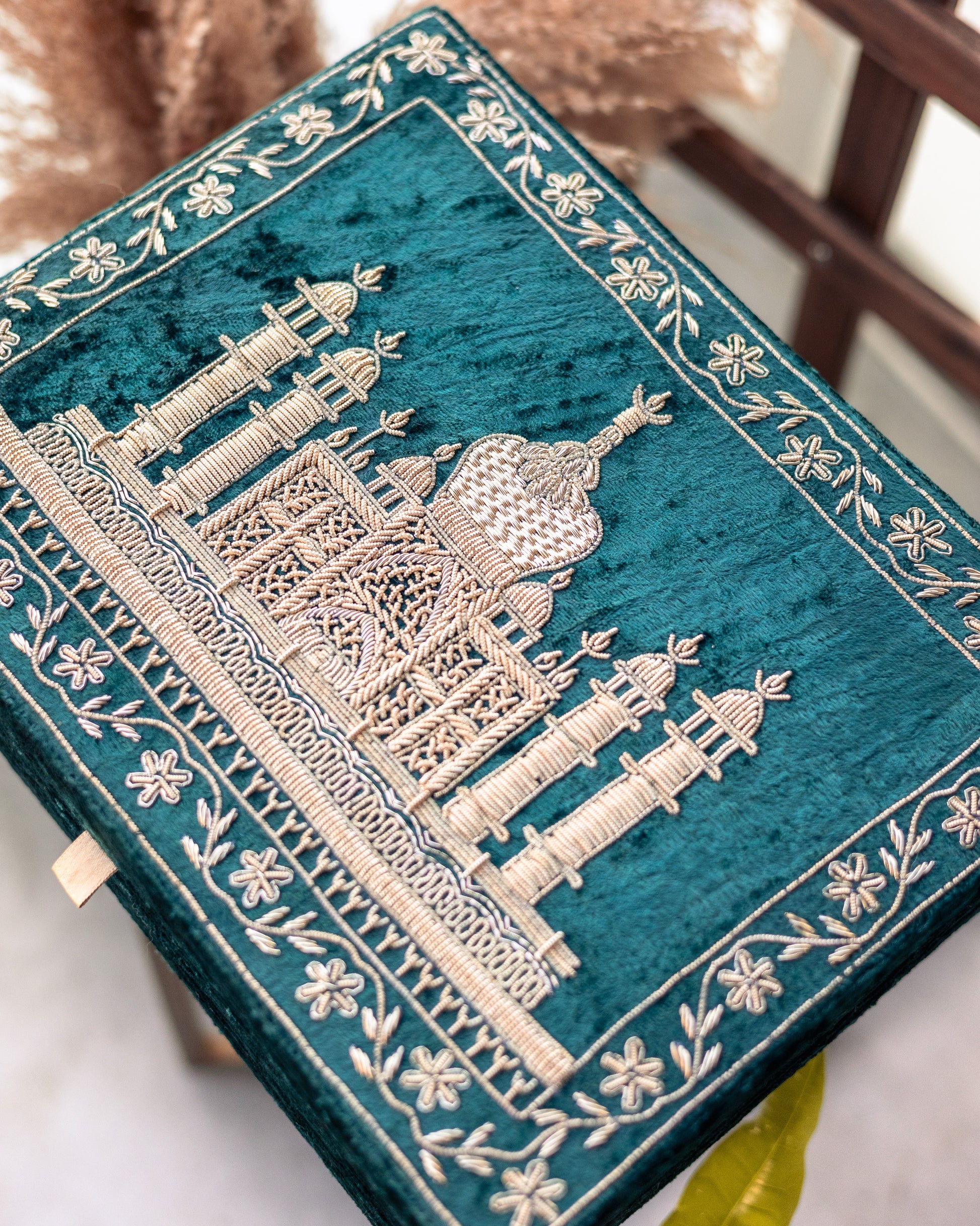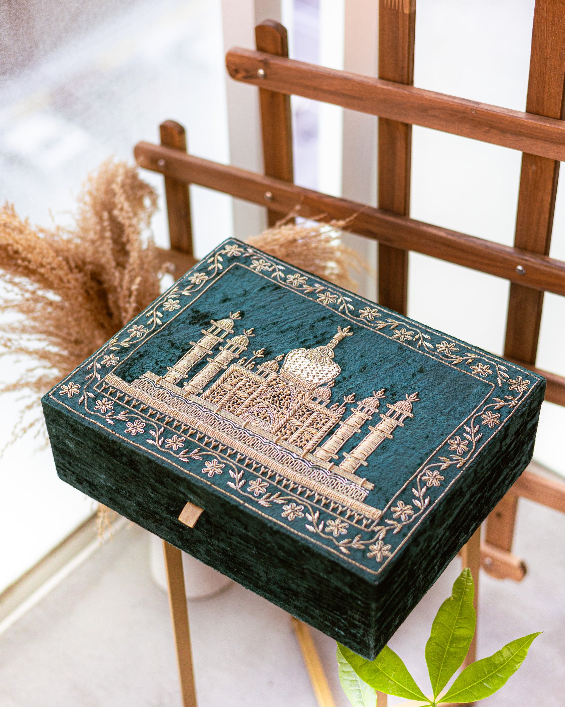 Elevate your jewelry game with our Embroidered Taj Mahal Velvet Jewelry Box in Green and experience the luxurious feel of Mughal royalty every time you use it.
