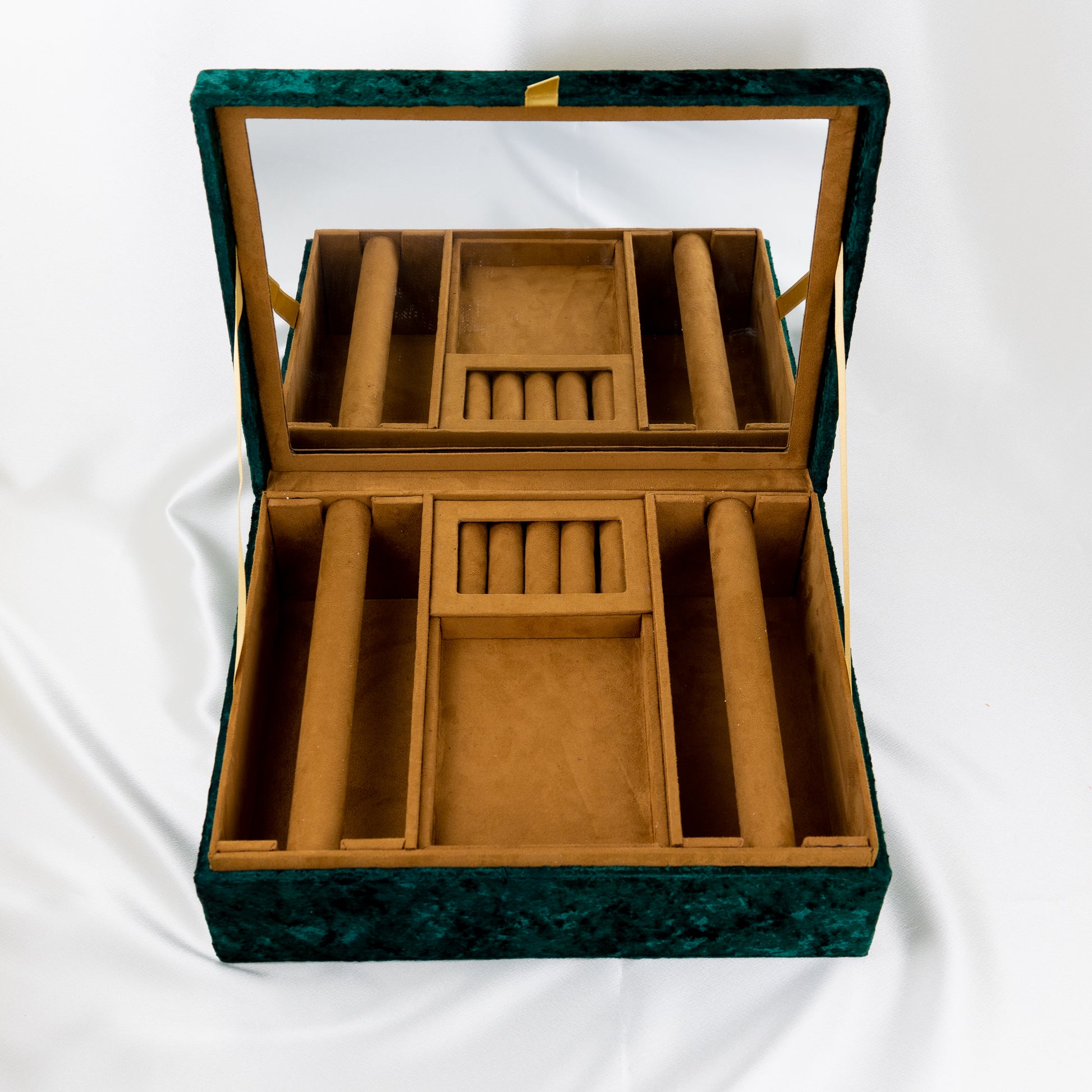 Transport yourself to the opulent world of Mughal emperors with our Embroidered Taj Mahal Velvet Jewelry Box in Green. This stunning masterpiece is the perfect addition to your bridal collection, with a dedicated section for your precious rings and bangles. The lush velvet exterior is adorned with intricate embroidery, reminiscent of the beautiful architecture of the iconic Taj Mahal.