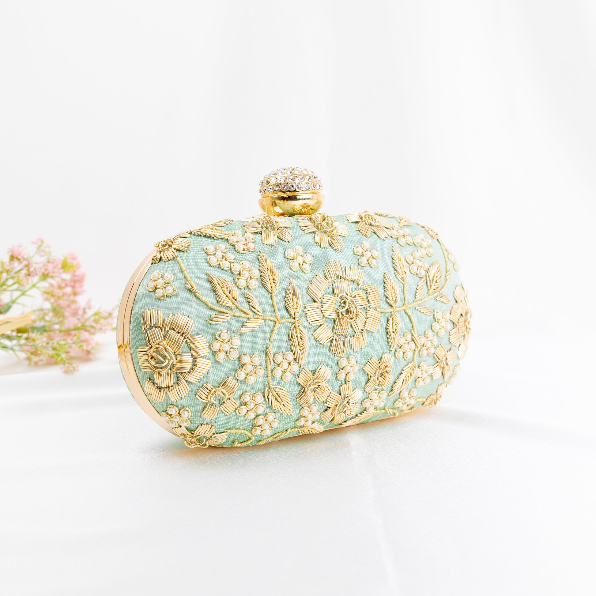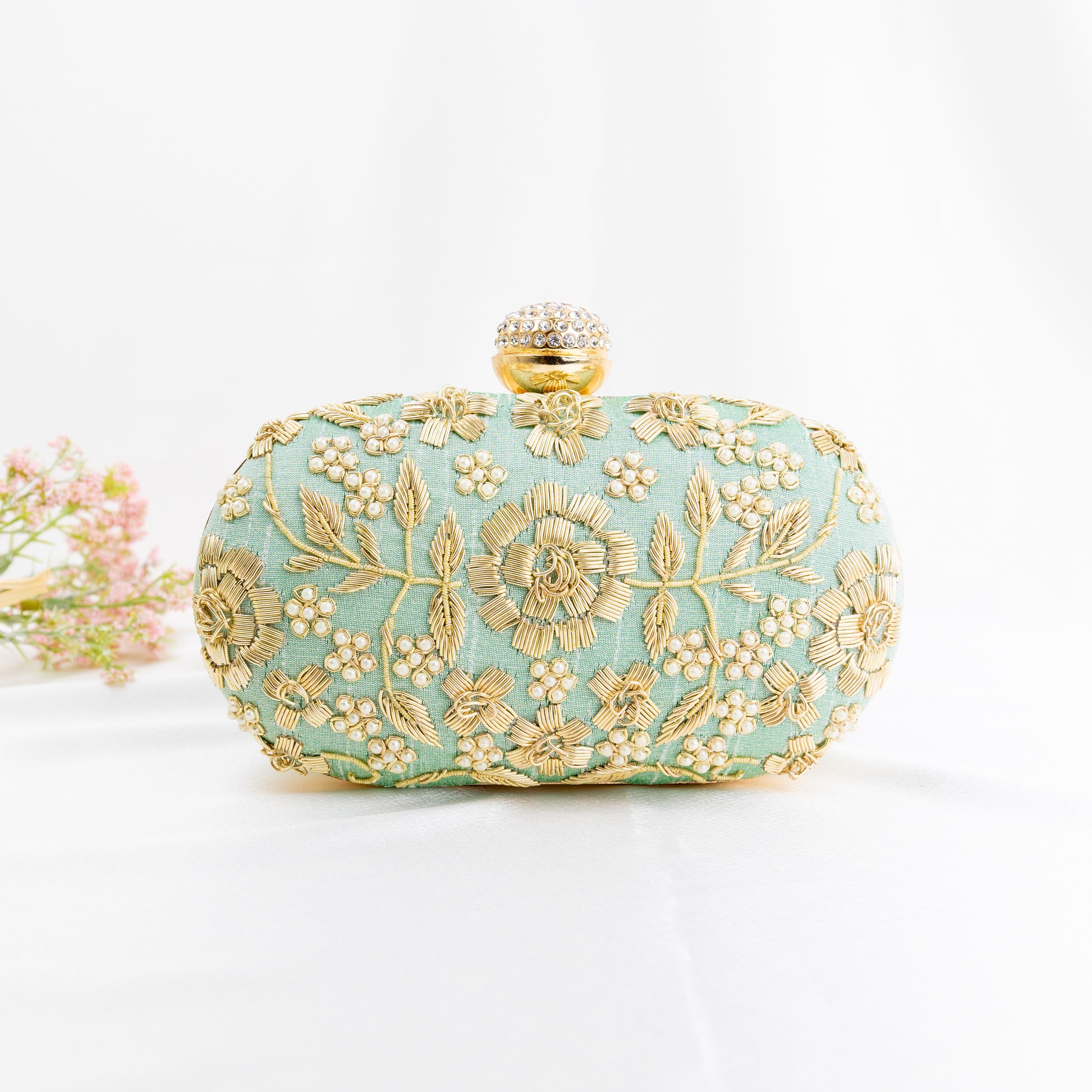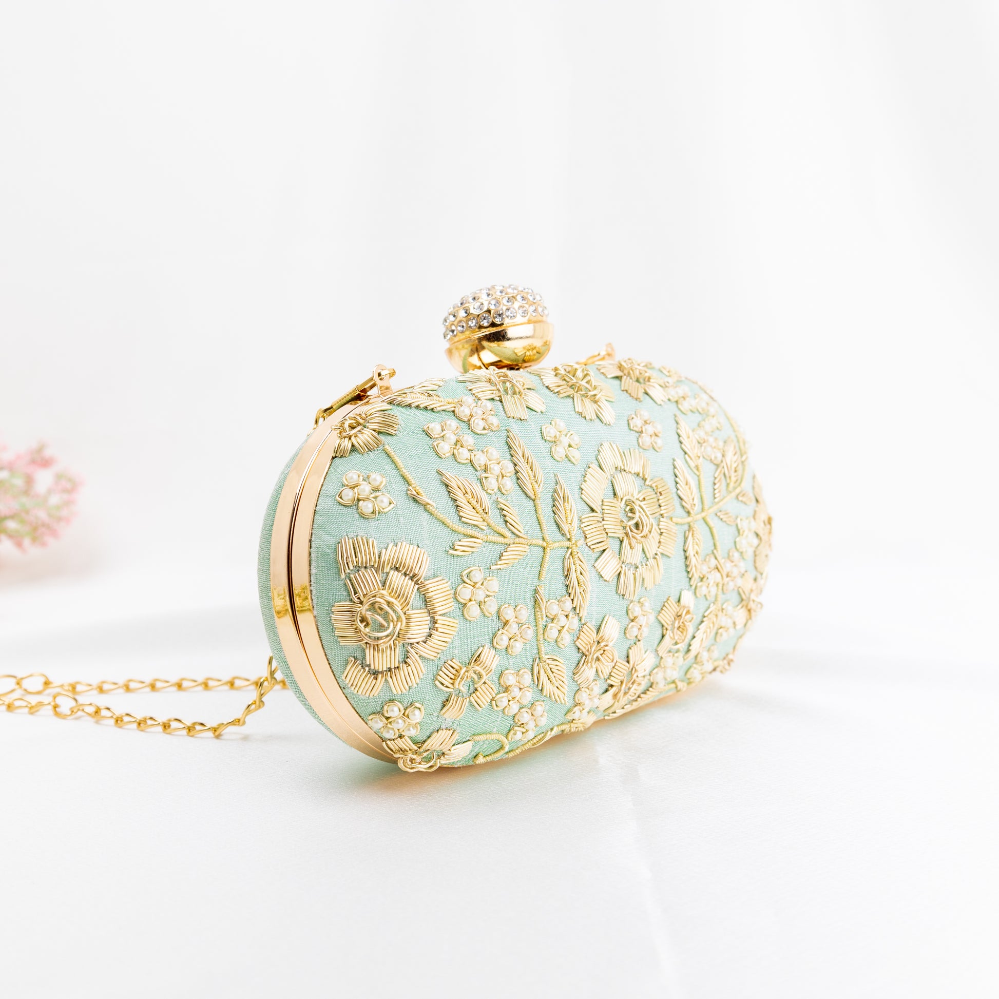 Introducing the York Clutch - a stunning statement piece that will elevate any outfit to new heights of elegance. Crafted with the finest light green silk and adorned with intricate golden embroidery, this clutch is the perfect accessory for your special occasions. The golden chain adds a touch of glamour and convenience, allowing you to carry it with ease while keeping your hands free to sip champagne or take pictures. Measuring at 7 x 4 inches, it's the perfect size to hold your essentials without weighing you down. Step out in style with the York Clutch and turn heads wherever you go.